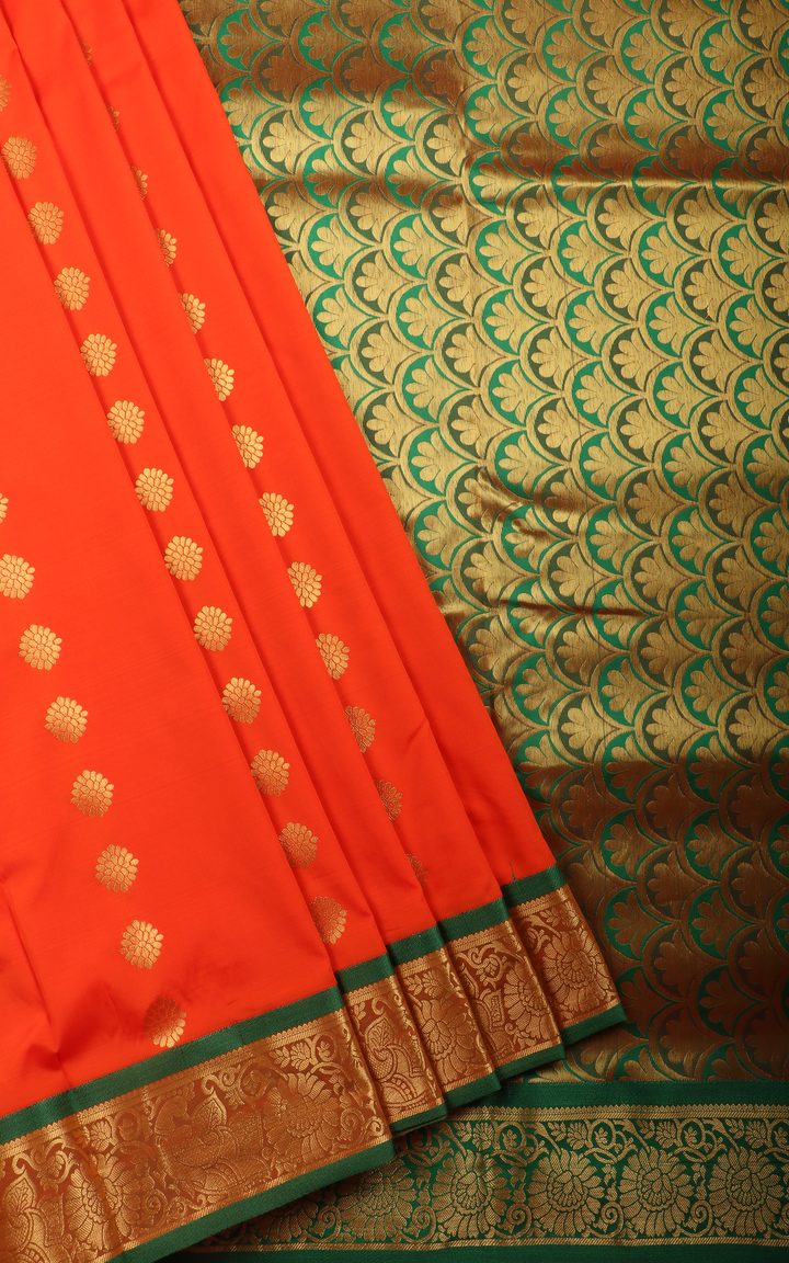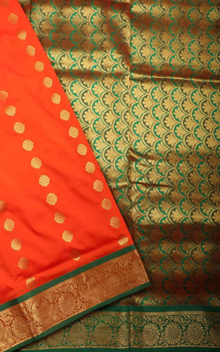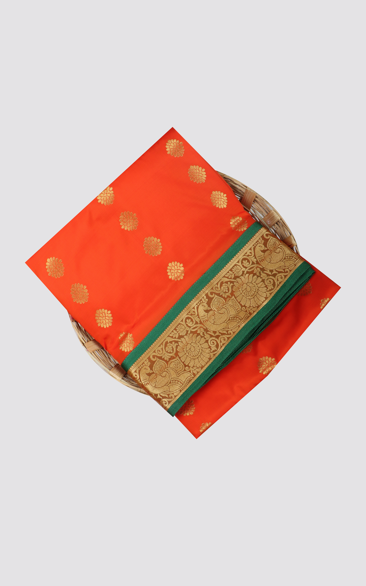 Deep Orange and Green 10 Yards Poly Silk Saree with Allover Zari Woven Buttas and Zari Woven Border without Blouse