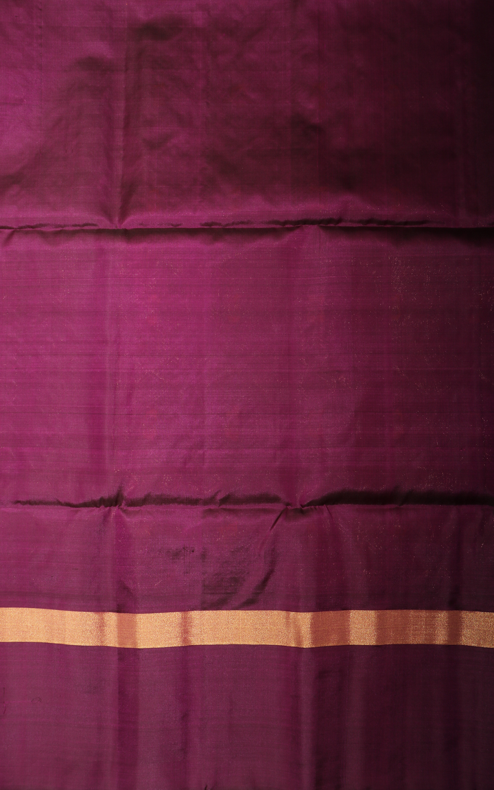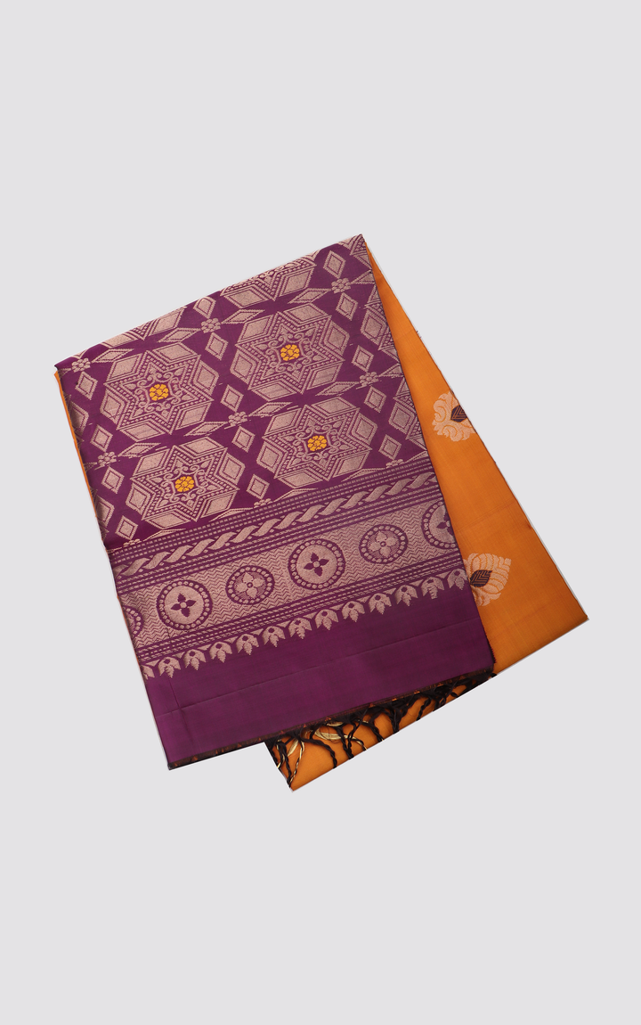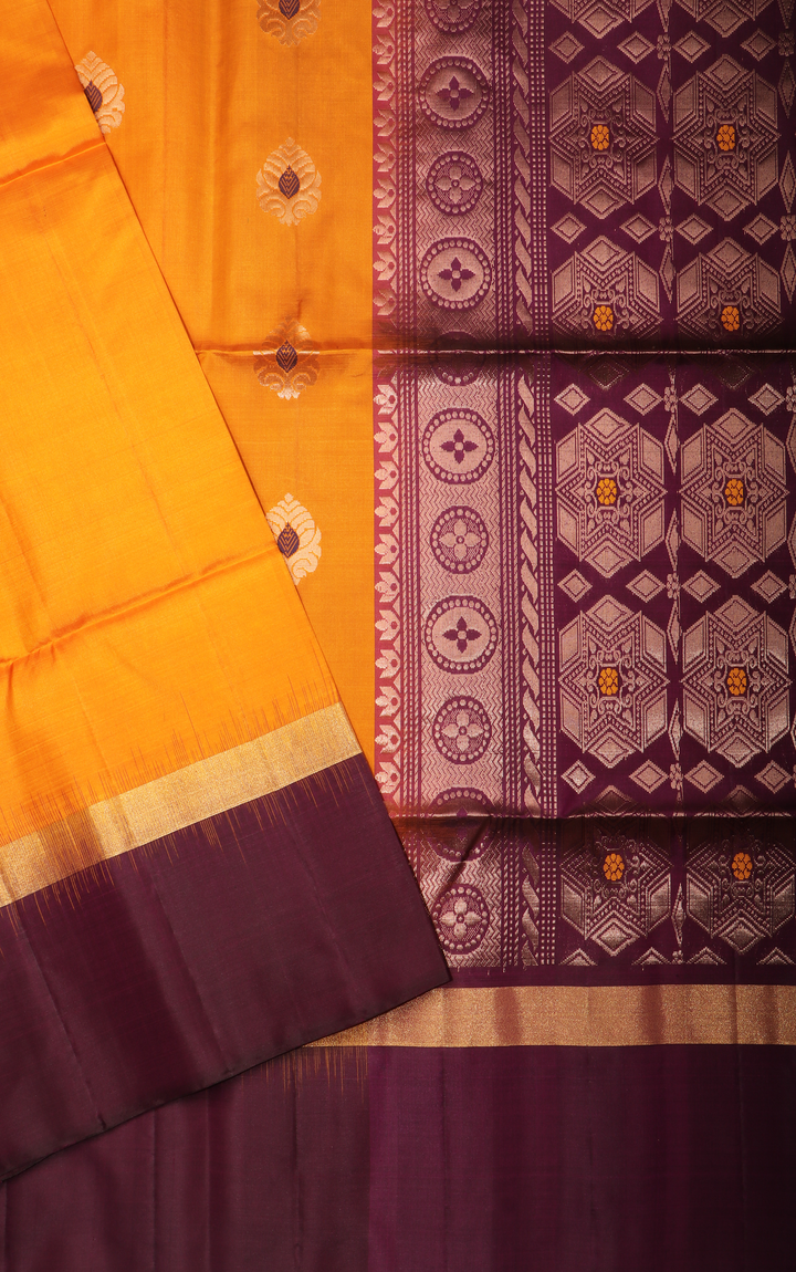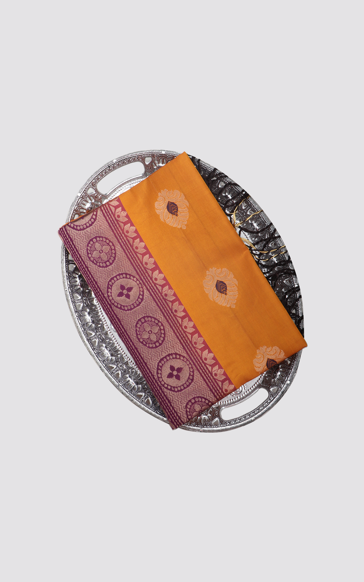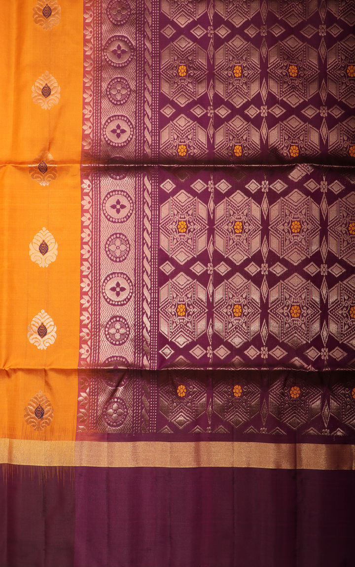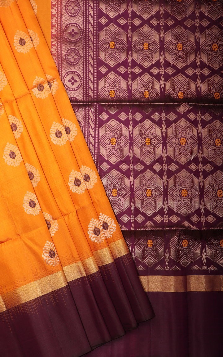 Golden Yellow and Wine Pure Soft Silk Saree with Zari Woven Buttas and Contrast Plain Border