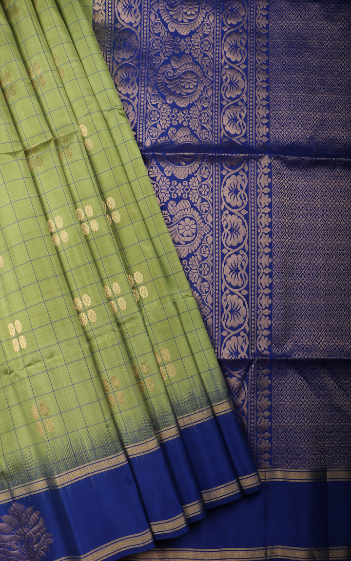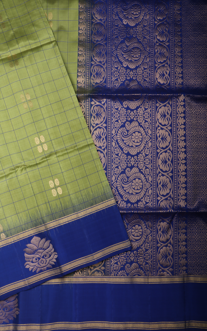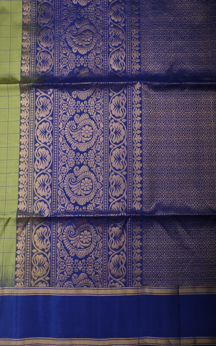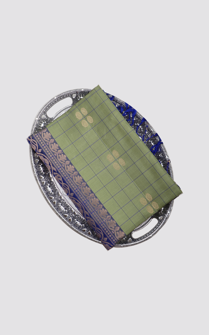 Green and Royal Blue Pure Soft Silk Saree with Allover Line Checked Pattern and Zari Woven Rettapet Border