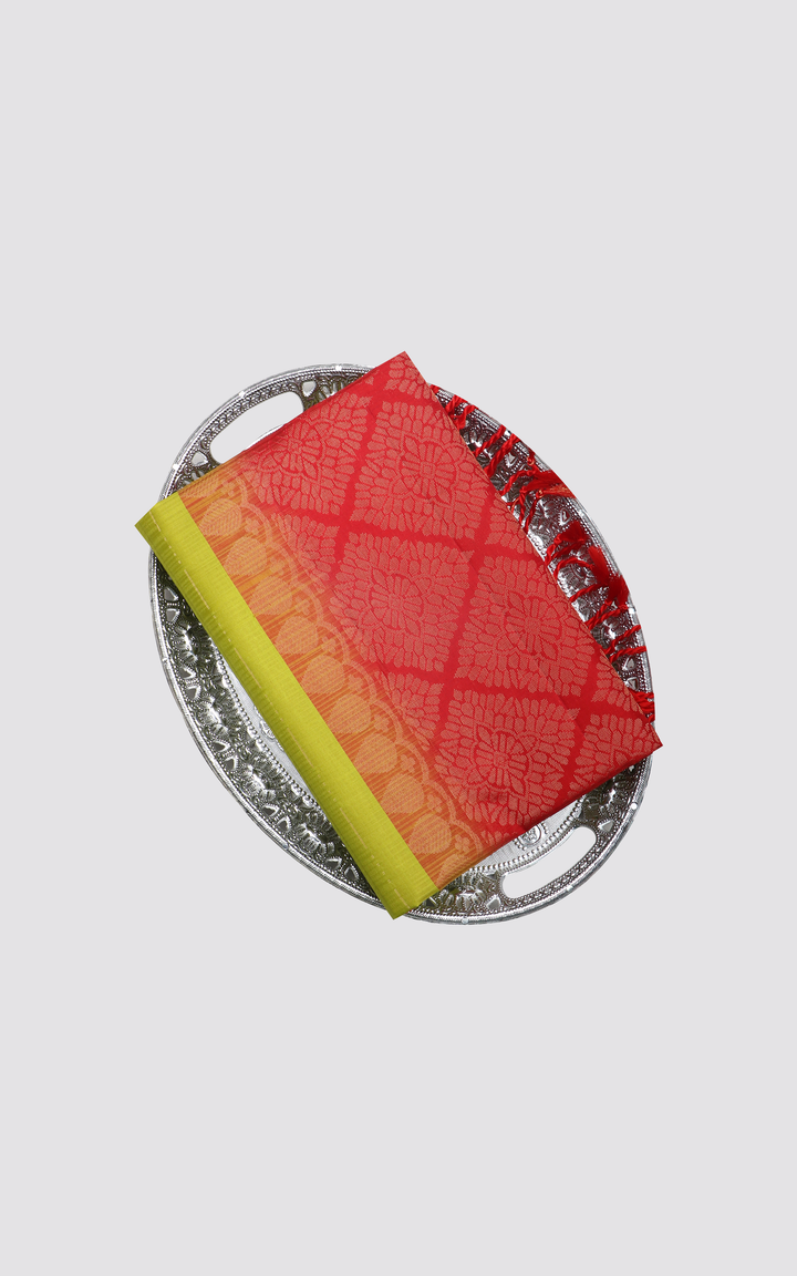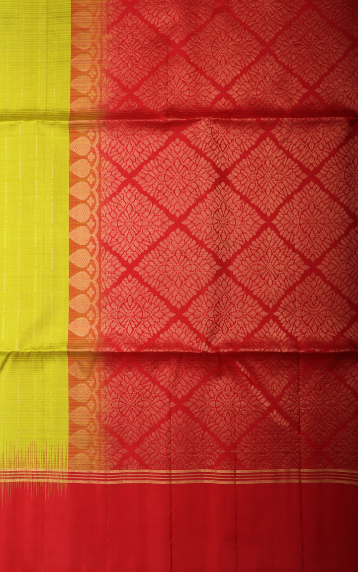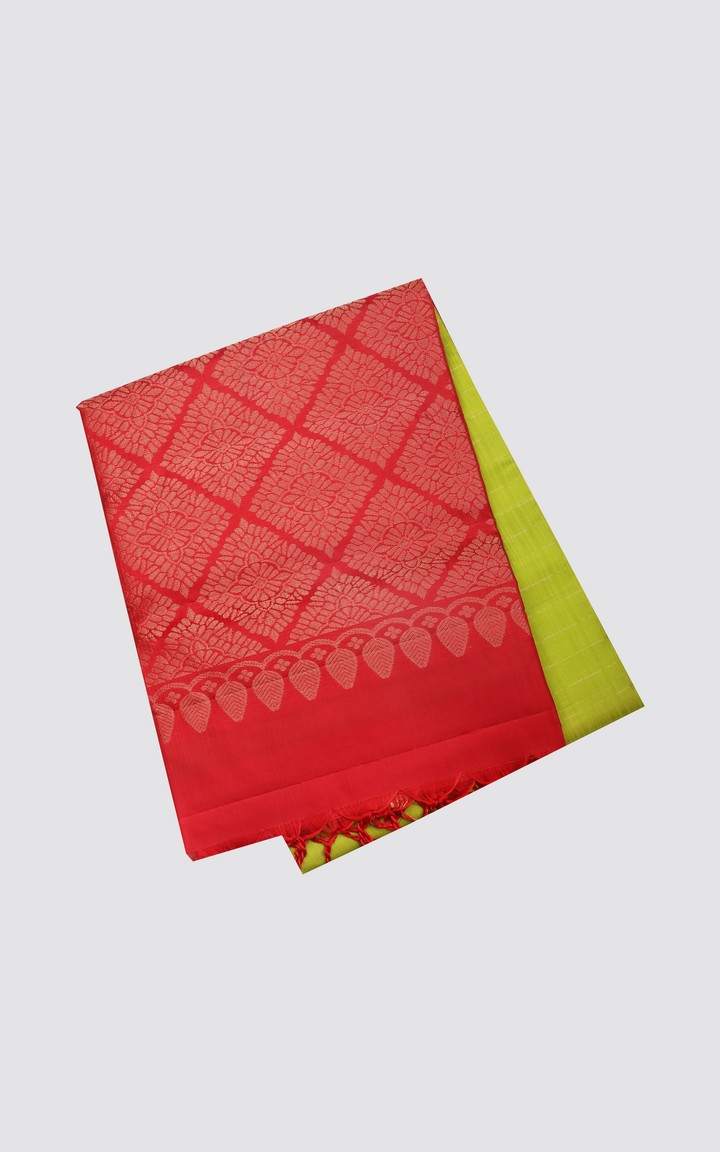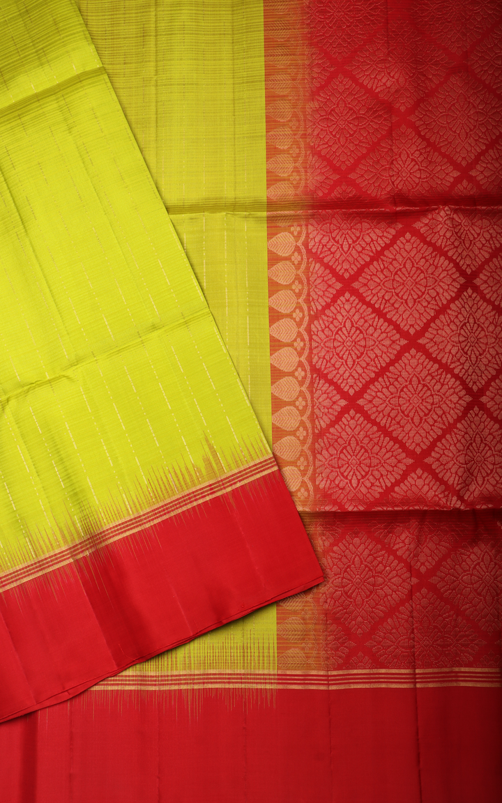 Lime Green and Red Pure Soft Silk with Vertical Zari Stripes and Plain Contrast Border