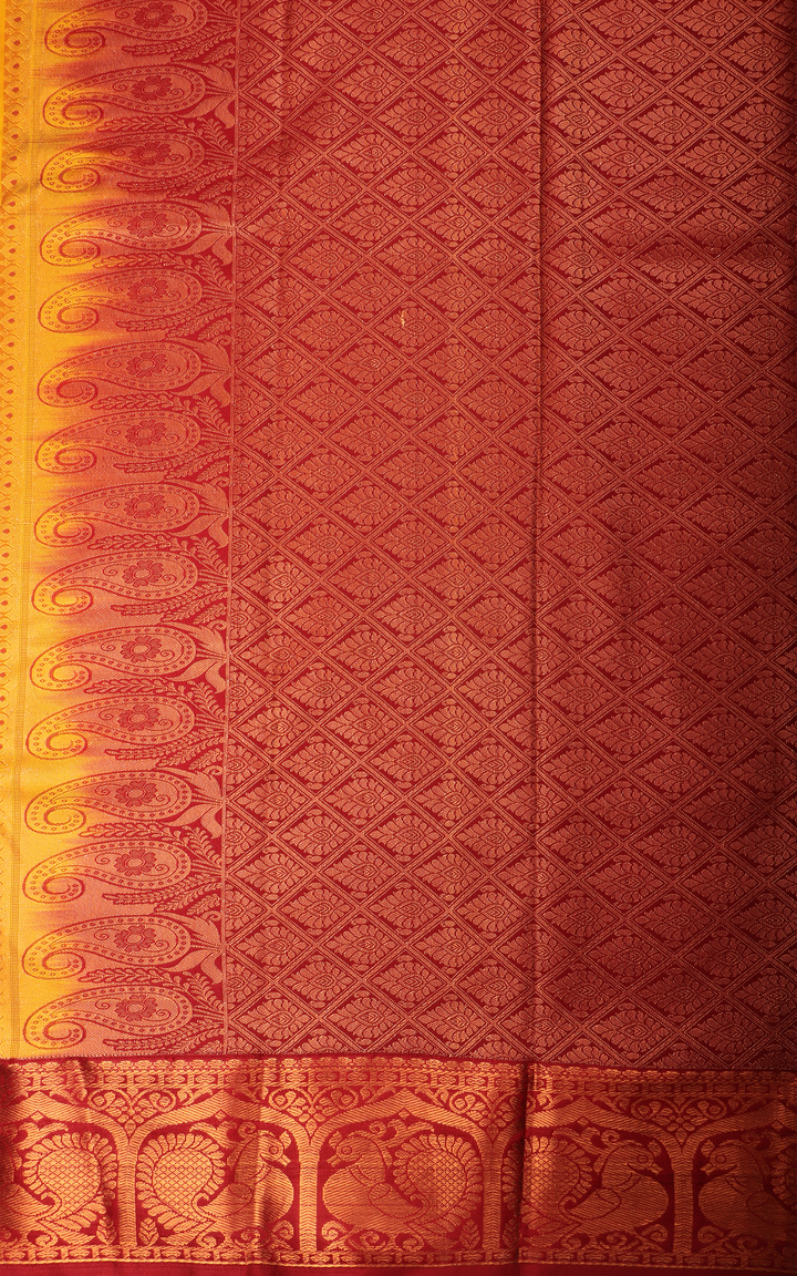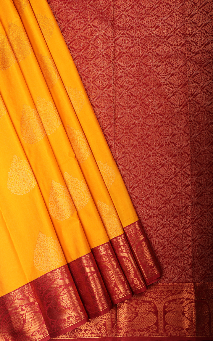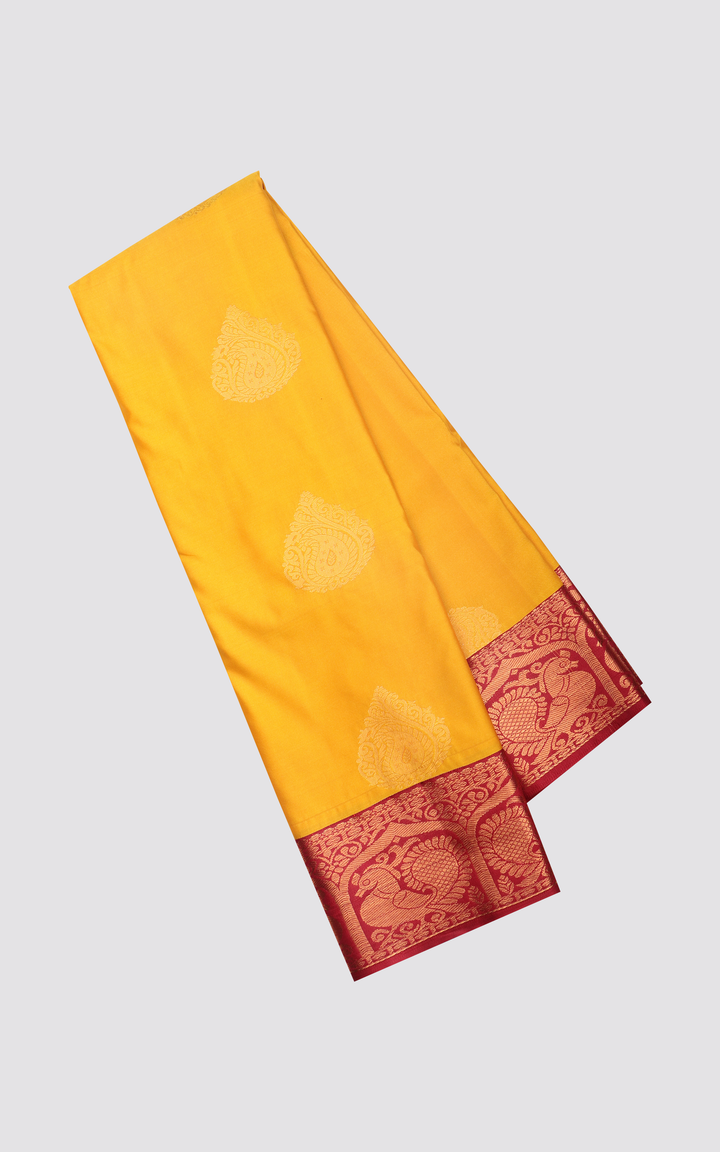 Mango Yellow and Red Semi Silk Saree with Zari Woven Buttas & Zari Woven Contrast Border