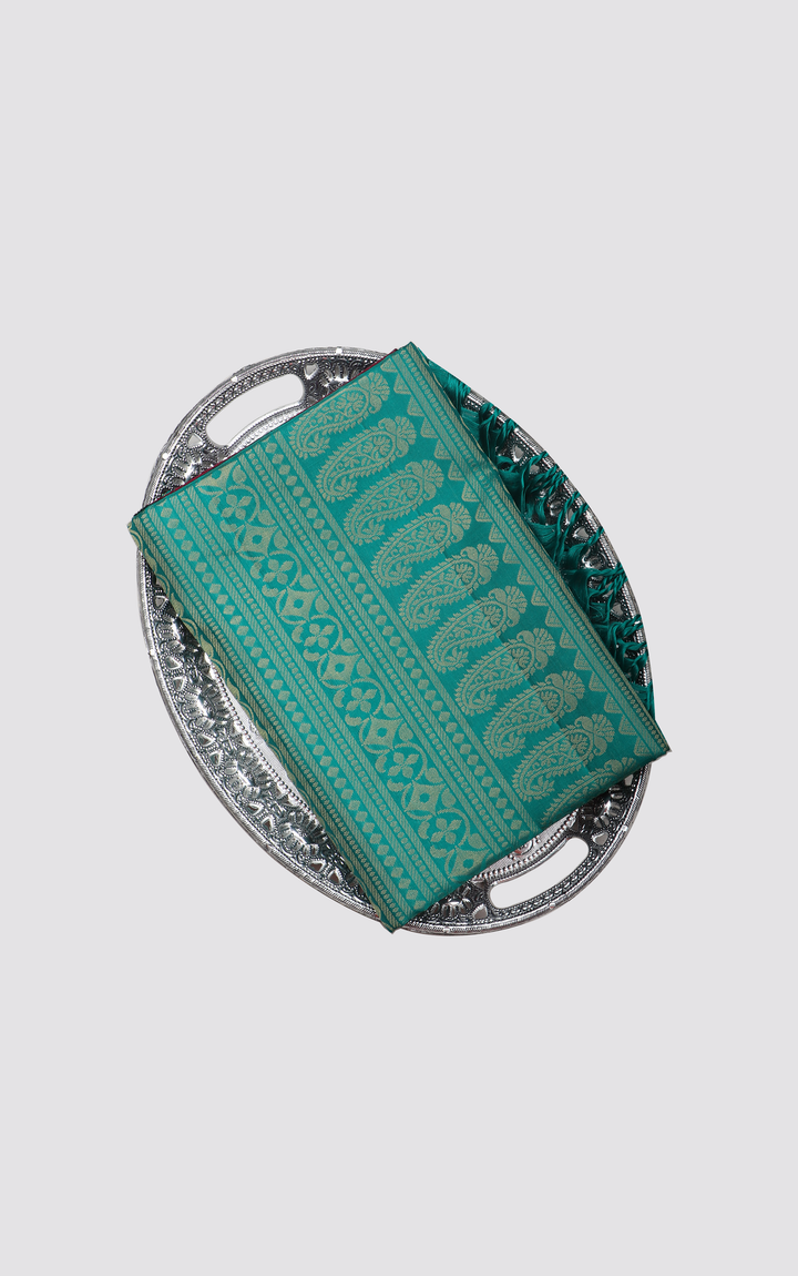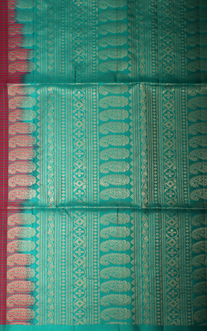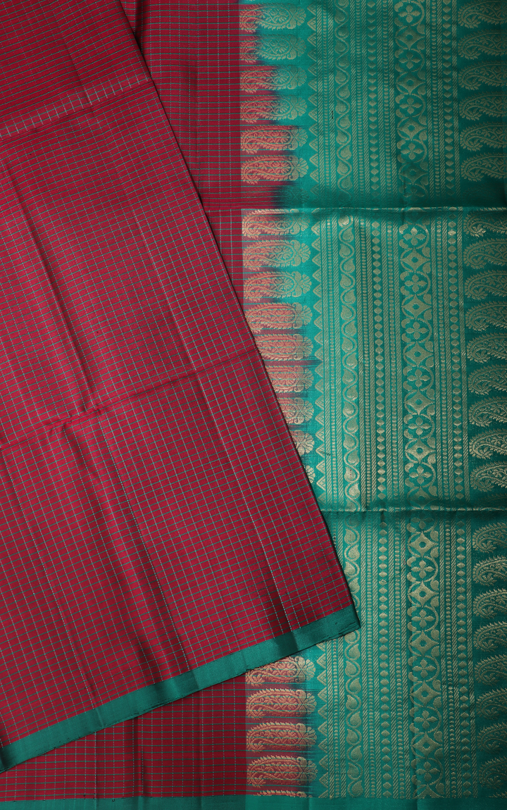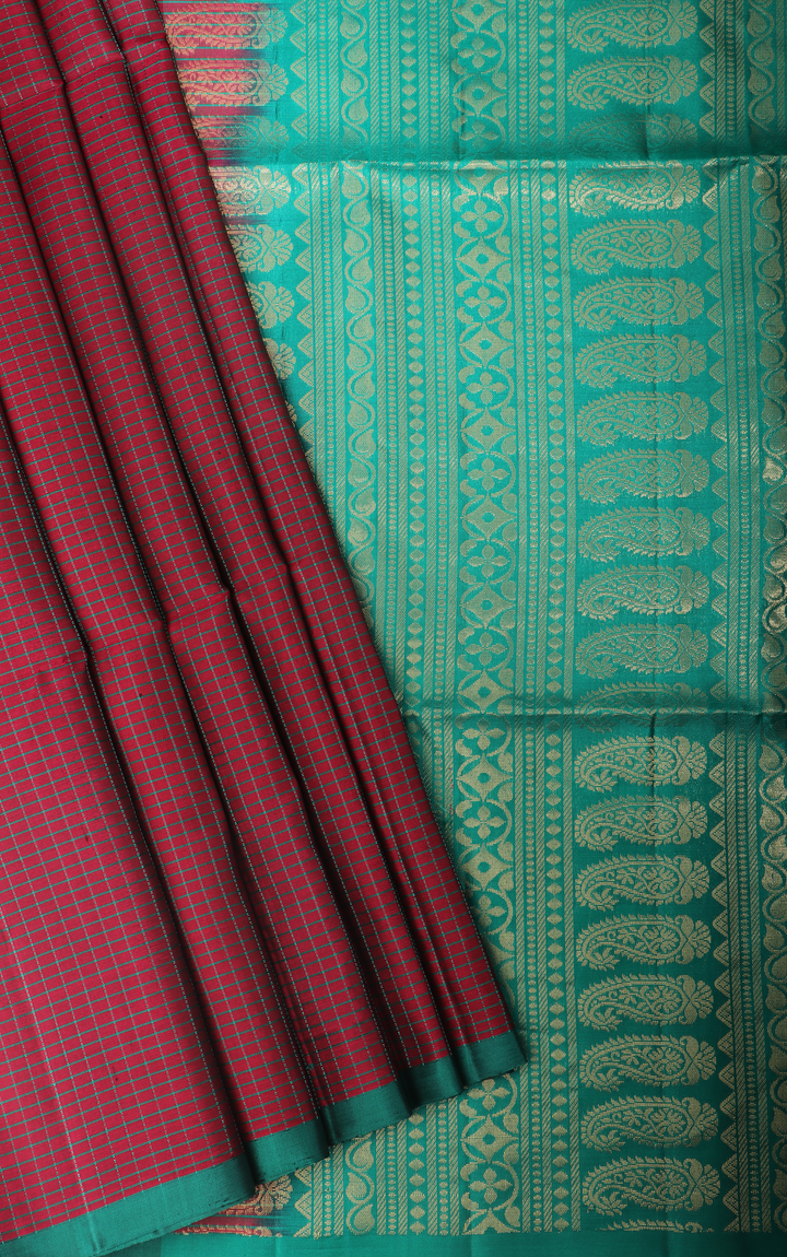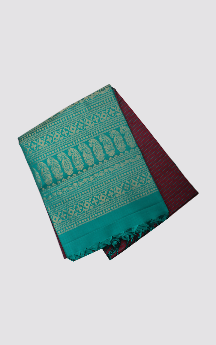 Maroon and Teal Green Pure Soft Silk Saree with allover Line Checks with Piping Border