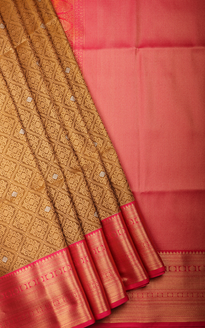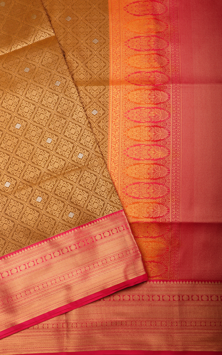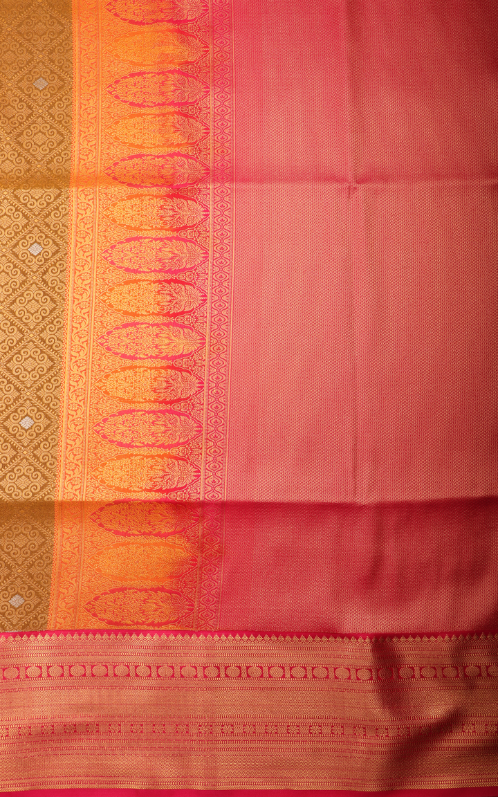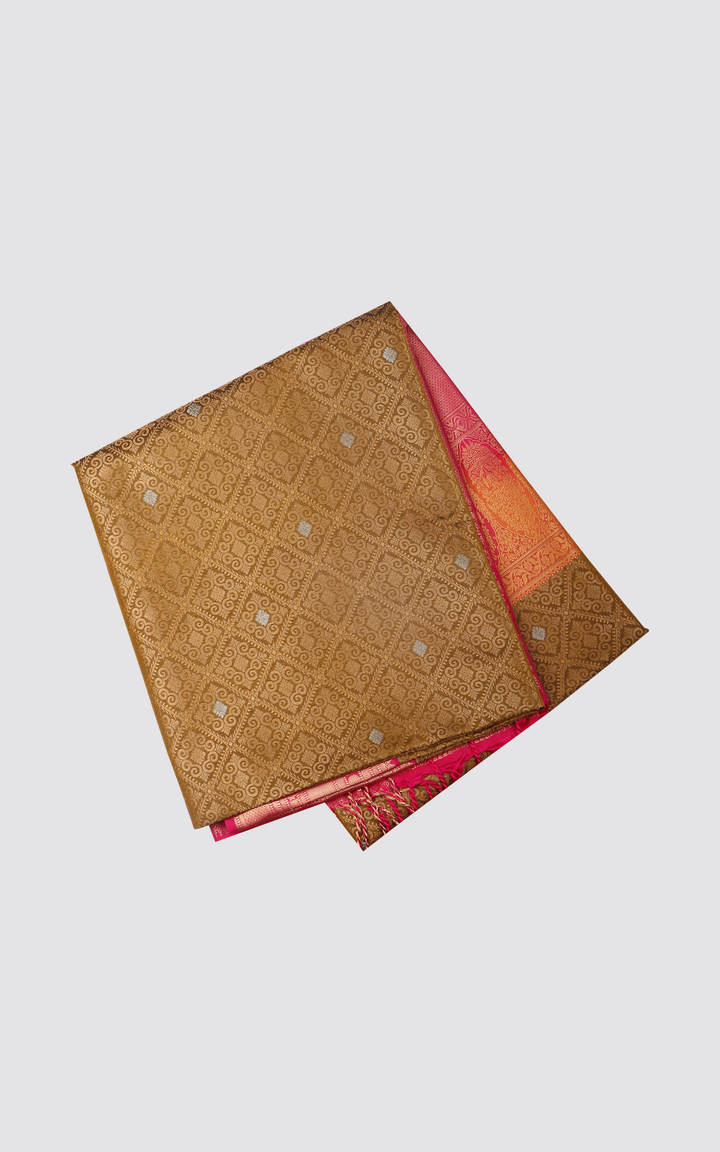 Mehendi Green and Pink Fancy Pattu Saree with Allover Zari Brocade Weaves and Zari Woven Contrast Border