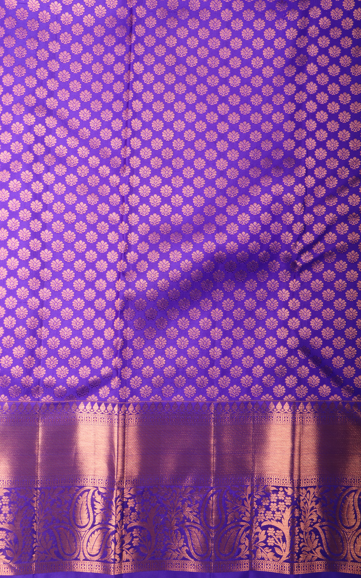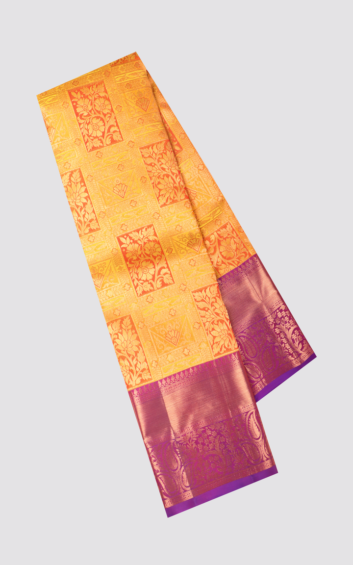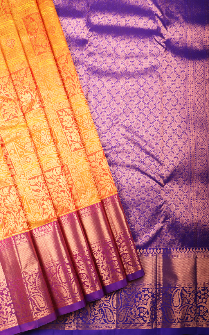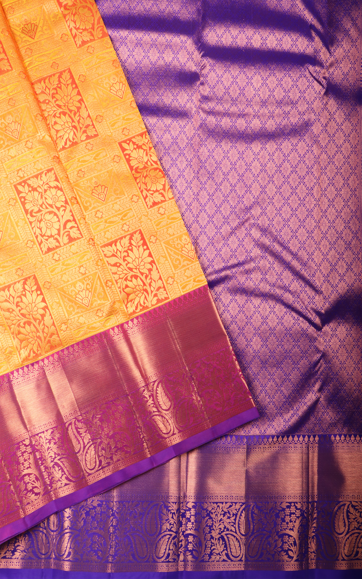 Mustard Yellow and Violet Pure Kanjivaram Silk Saree with Allover Floral Zari Brocade Weaves and Zari Woven Korvai Border
