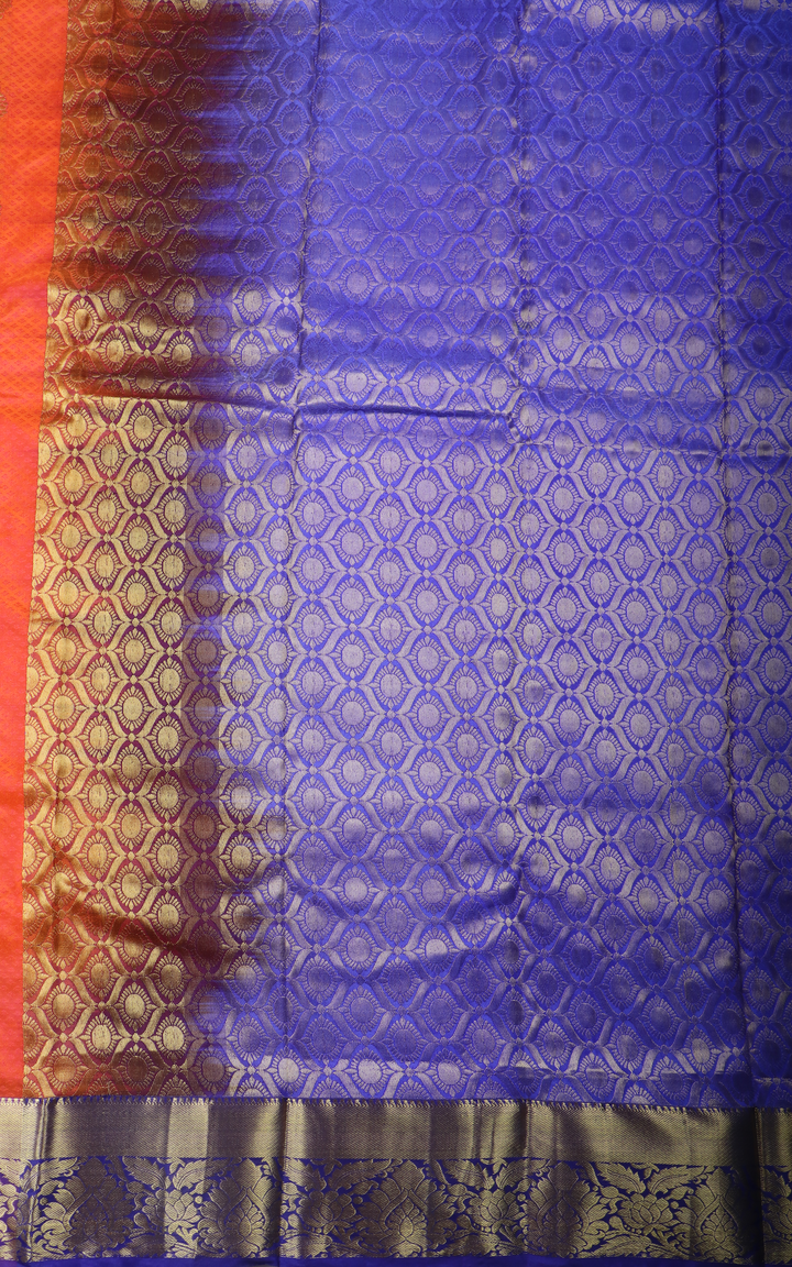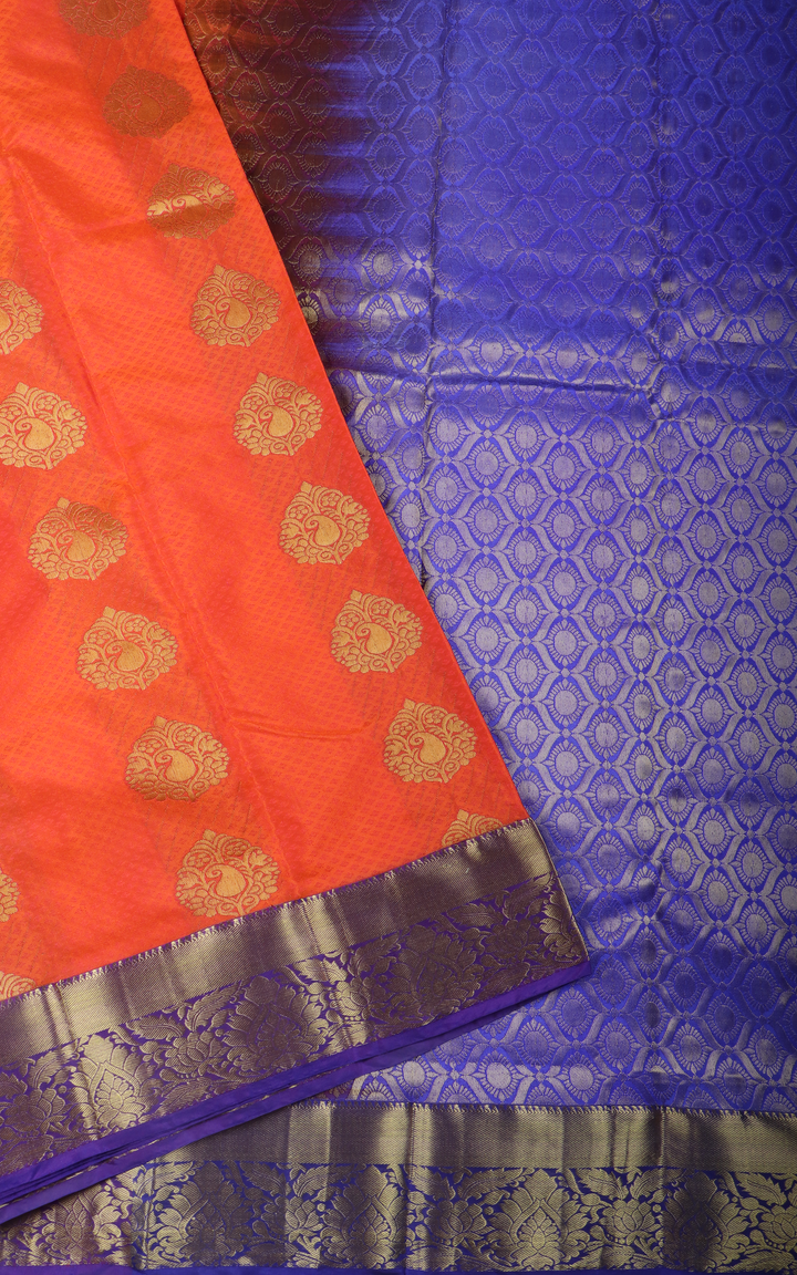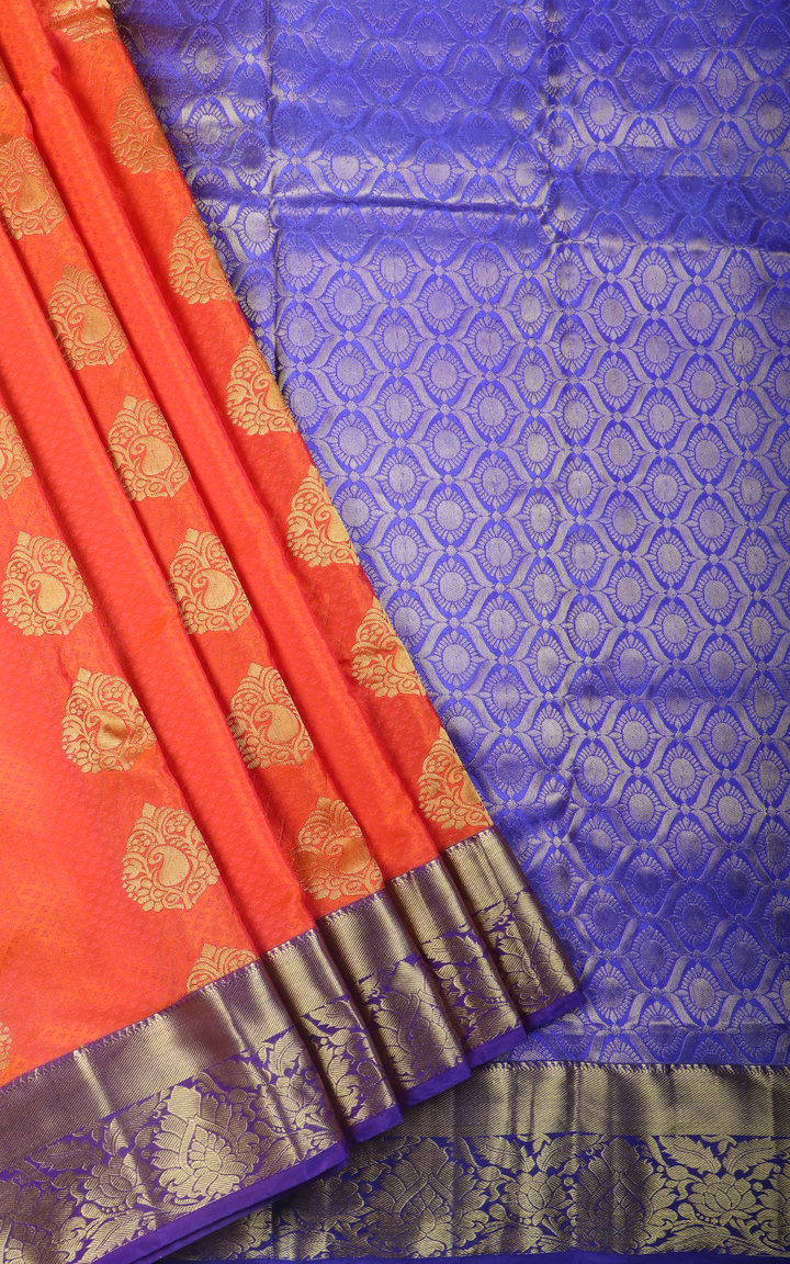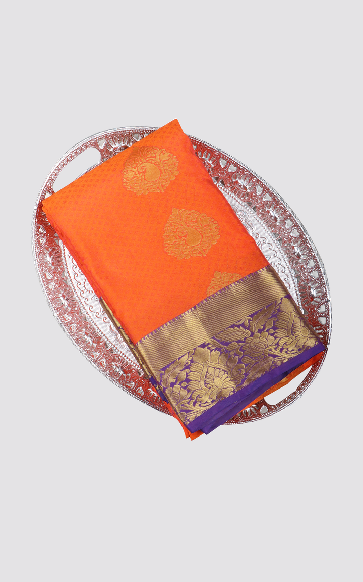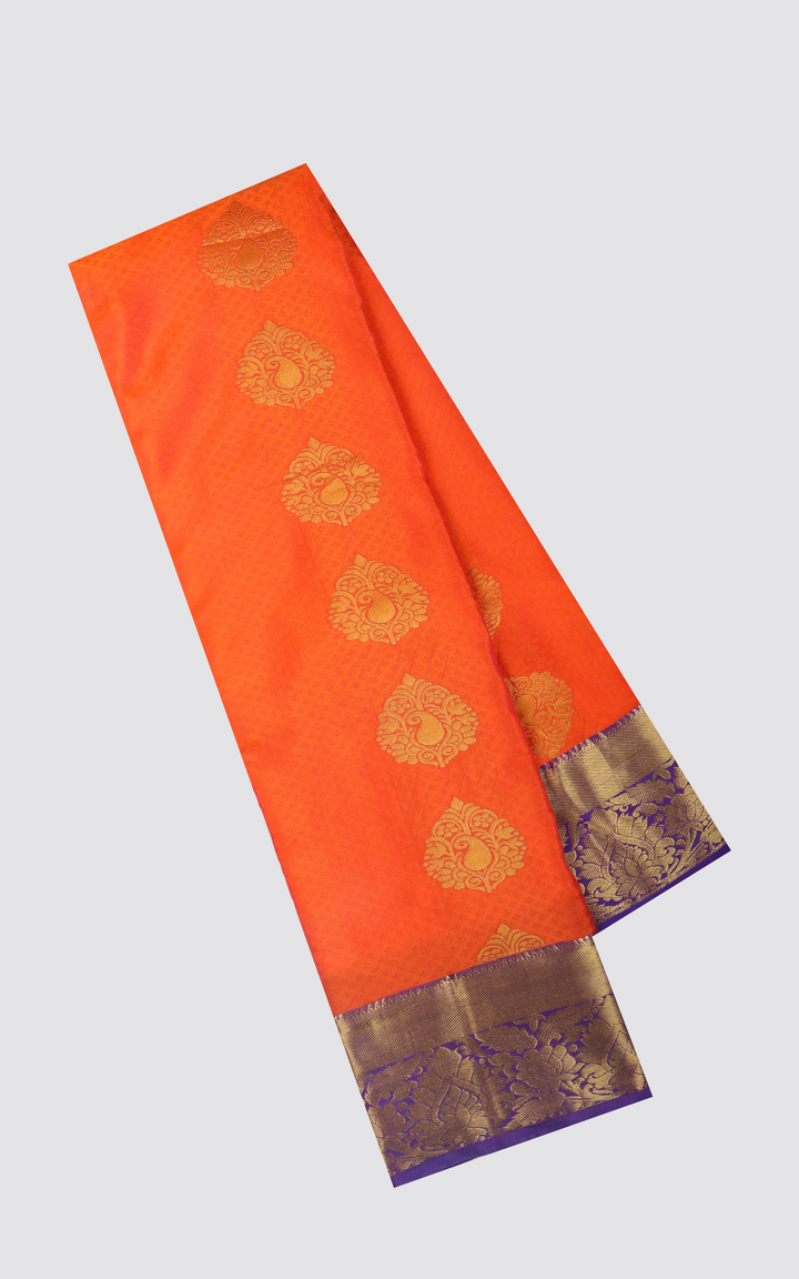 Step into timeless elegance with our Semi Kanjivaram Silk Saree in Orange and Violet. Featuring a beautiful self-emboss pattern and a mesmerizing Zari woven Border, this saree is a symbol of sophistication. Crafted from luxurious semi silk, it drapes gracefully, enhancing your charm with every move. Elevate your ethnic charm with this SEO-friendly saree, perfect for making a statement at any occasion!