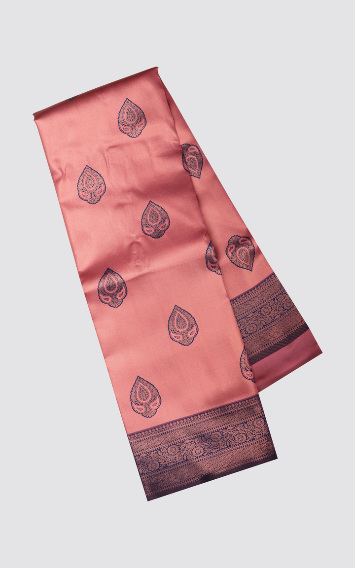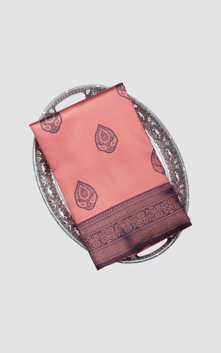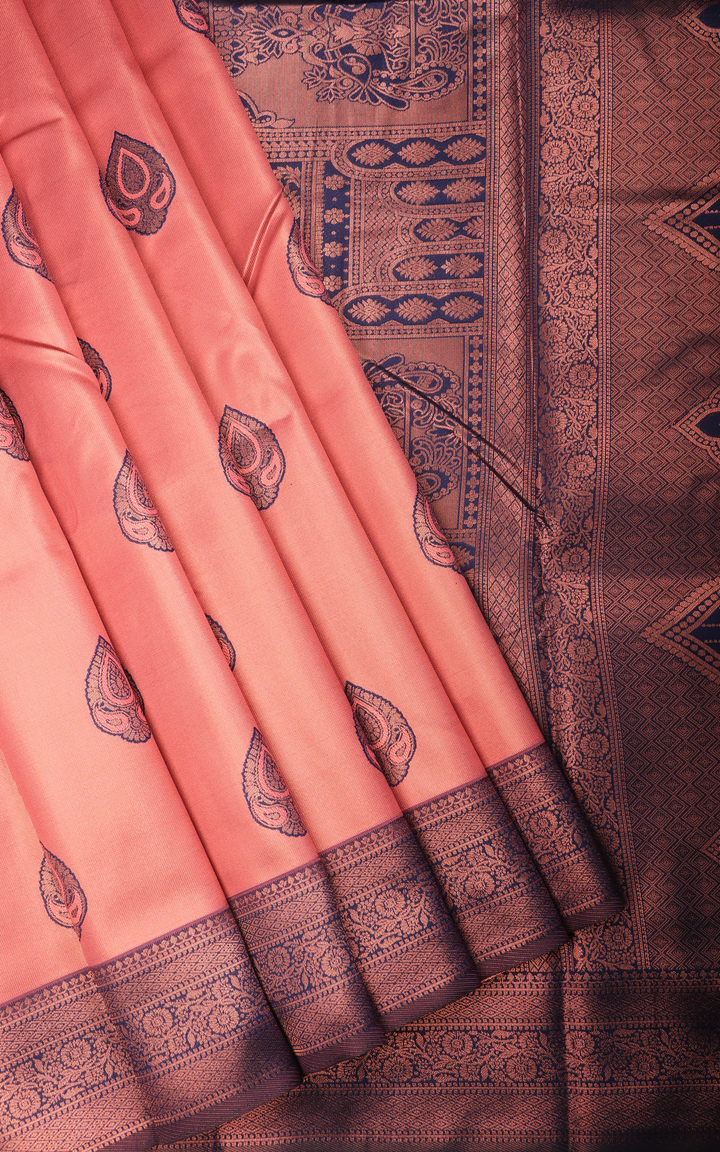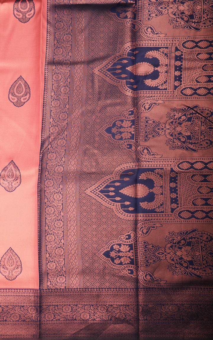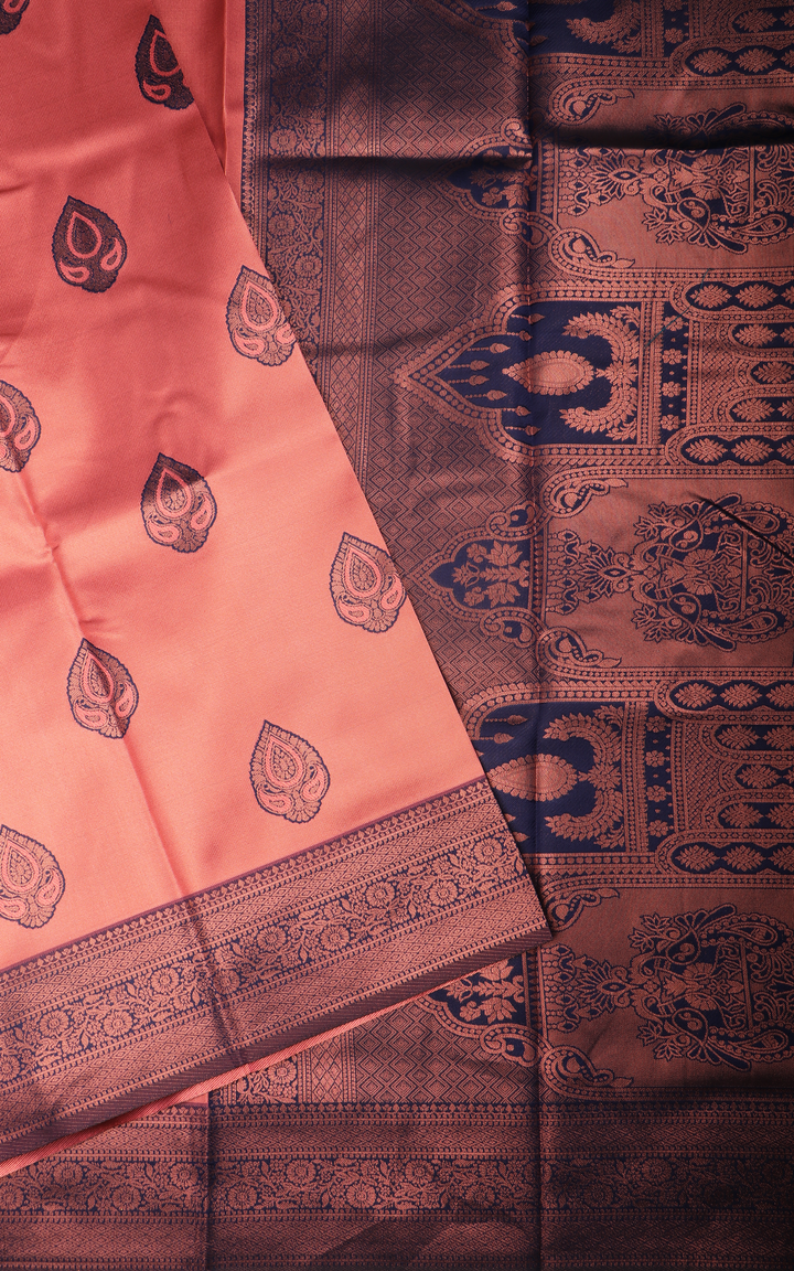 Peach and Navy Blue Softy Silk Saree with Subtle Zari Woven Buttas and Zari Woven Border