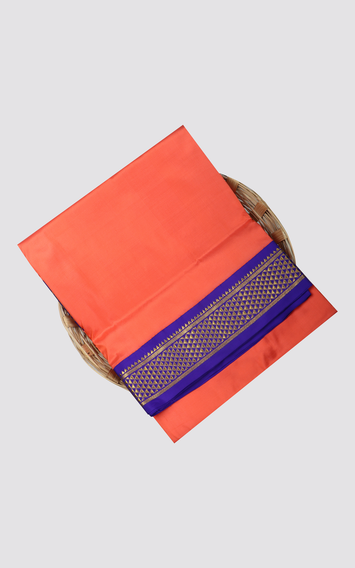 Peachish Orange and Dark Blue 10 Yards Pure Silk Saree with Plain Body and Zari Woven Border without Blouse