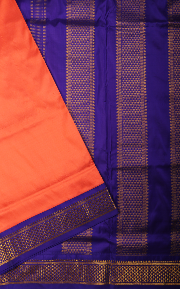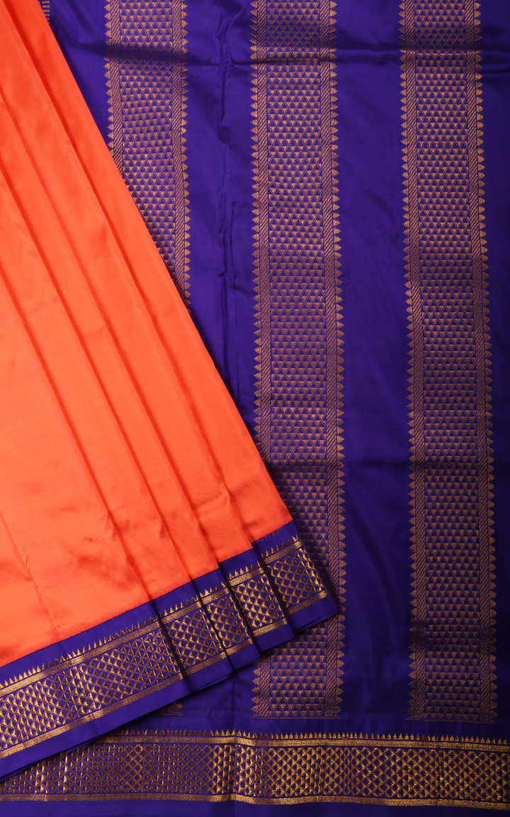Peachish Orange and Dark Blue 10 Yards Pure Silk Saree