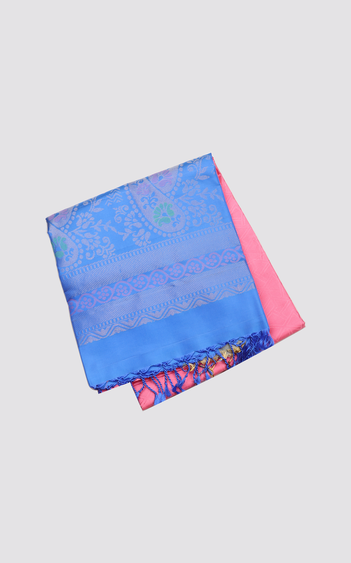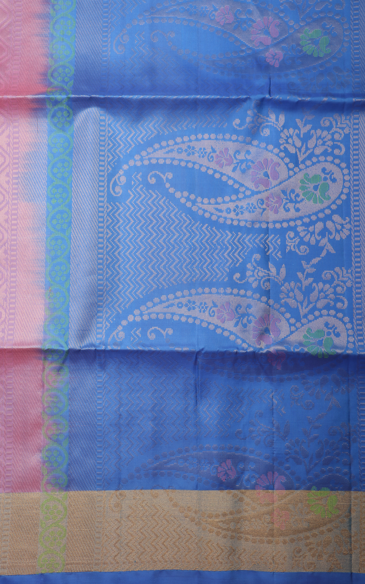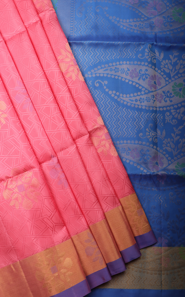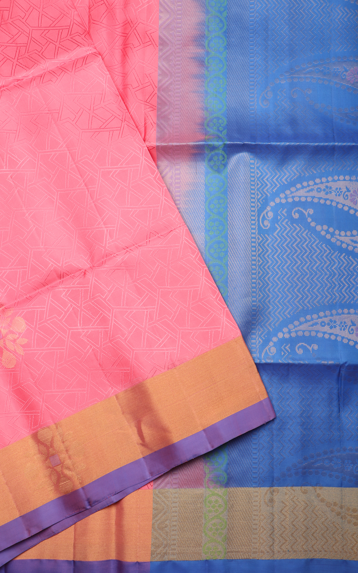 Pink and Blue Pure Soft Silk Saree with Allover Geometric Brocade Weaves and Zari Woven Plain Border
