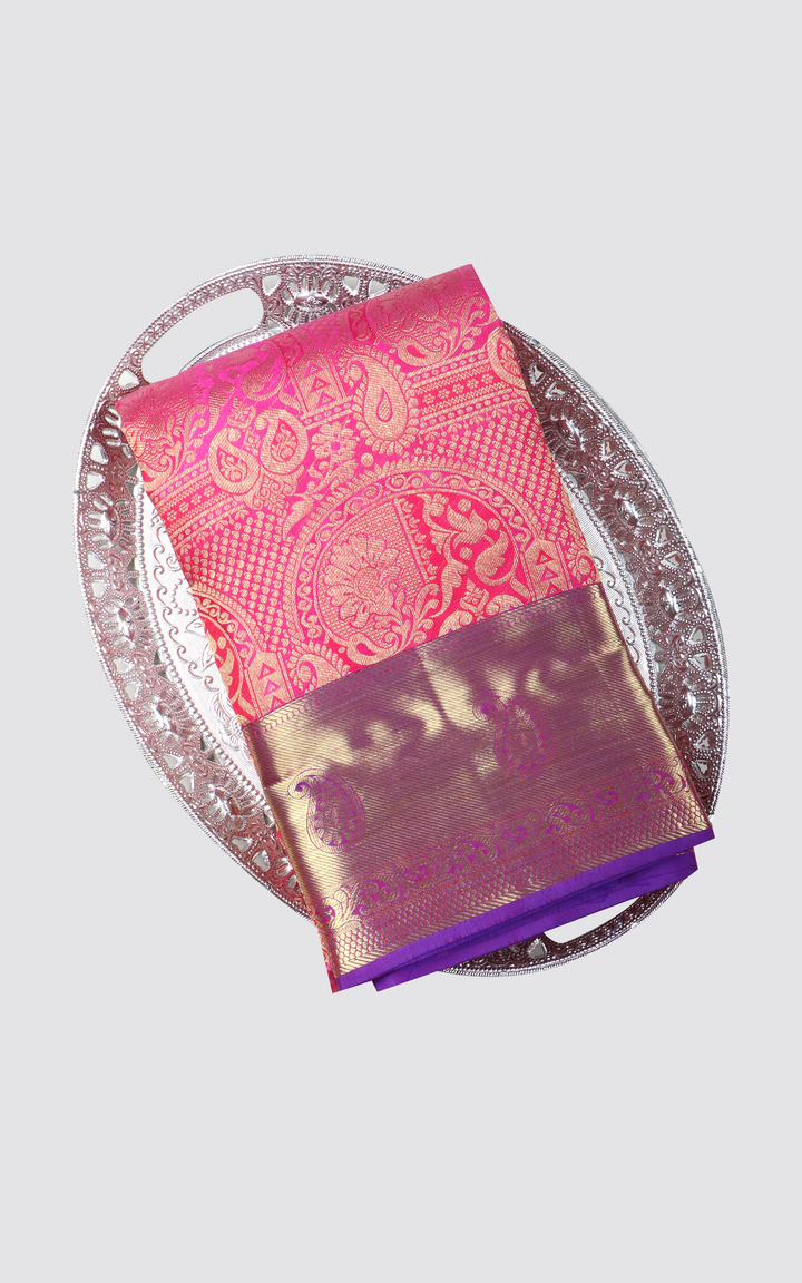 Pink and Violet Pure Kanjivaram Silk Saree with Allover Zari Brocade Weaves and Zari Woven Border