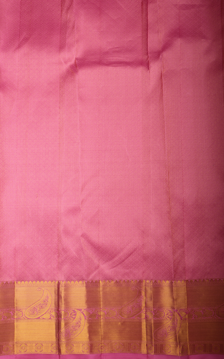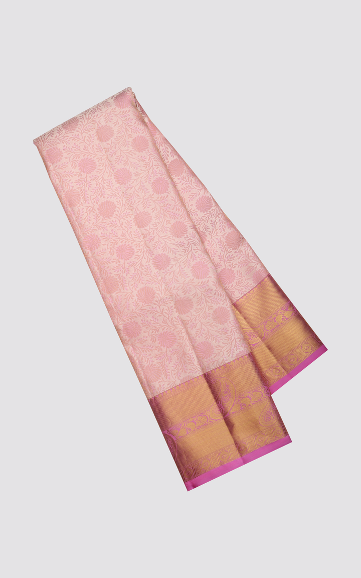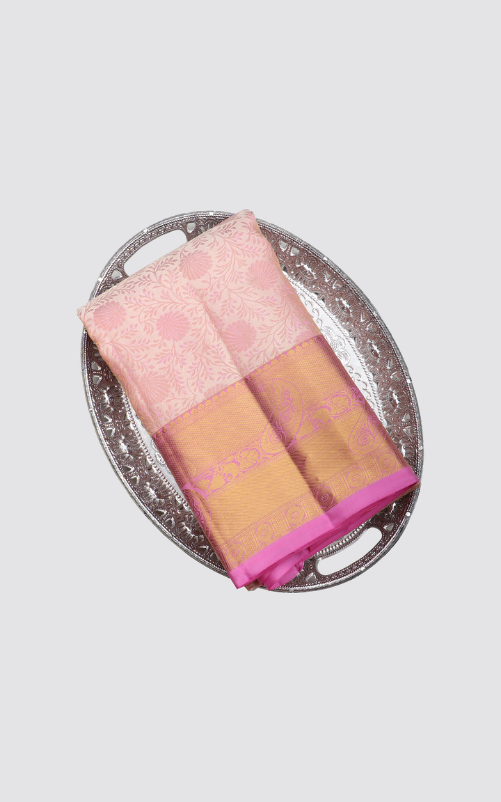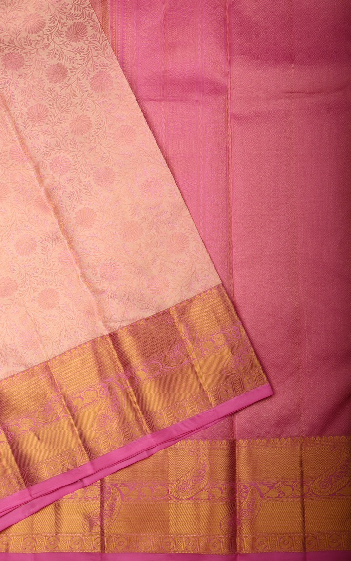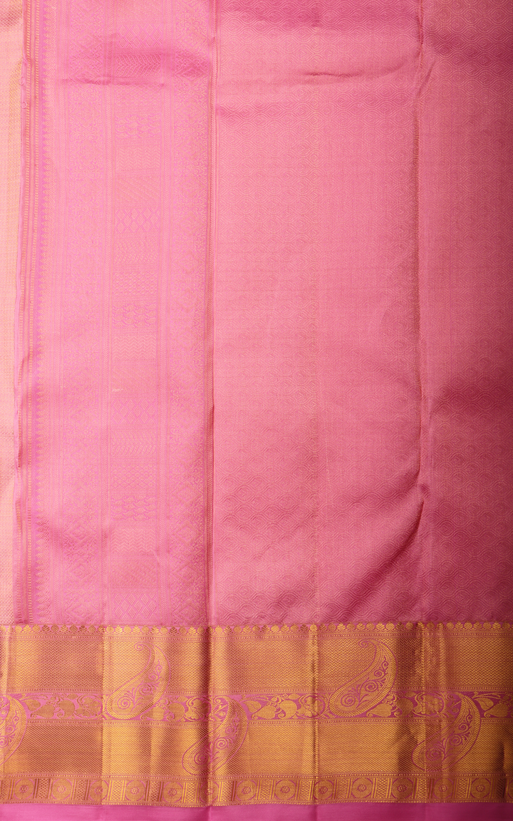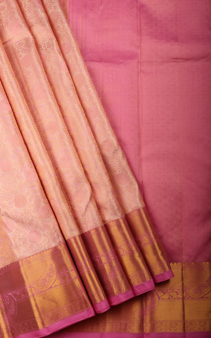 Pure Kanjivaram Silk Saree Peach and Pink with Allover Zari Brocade Weaves and Zari Woven Border