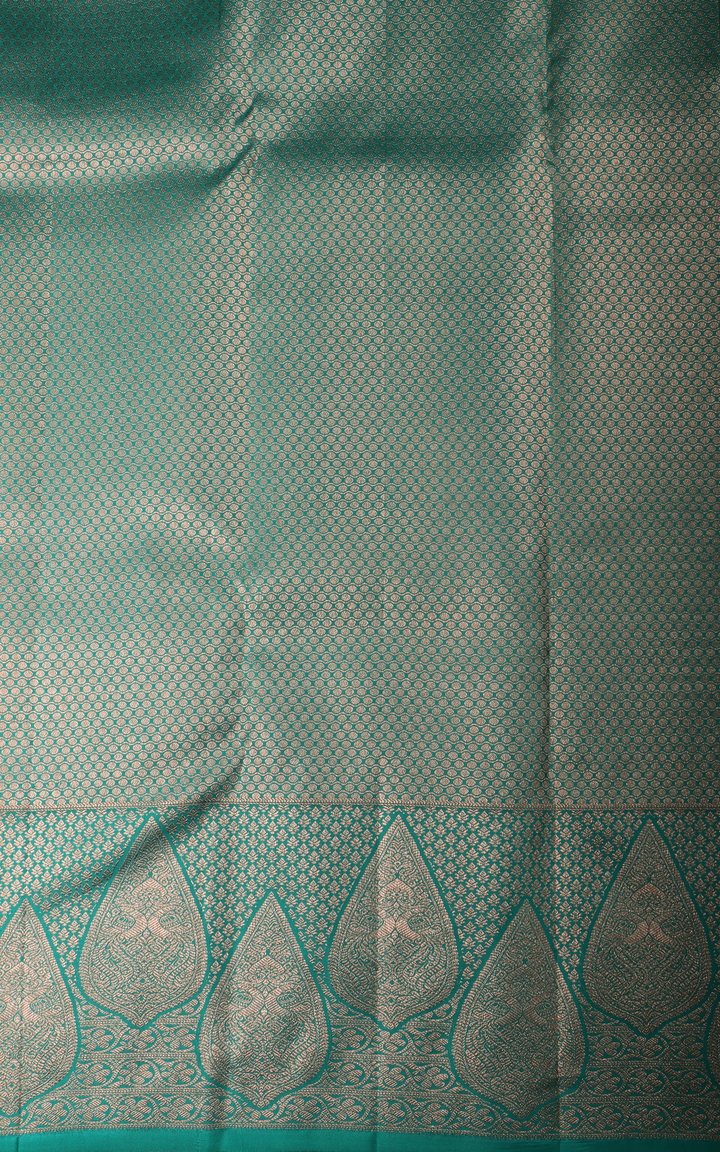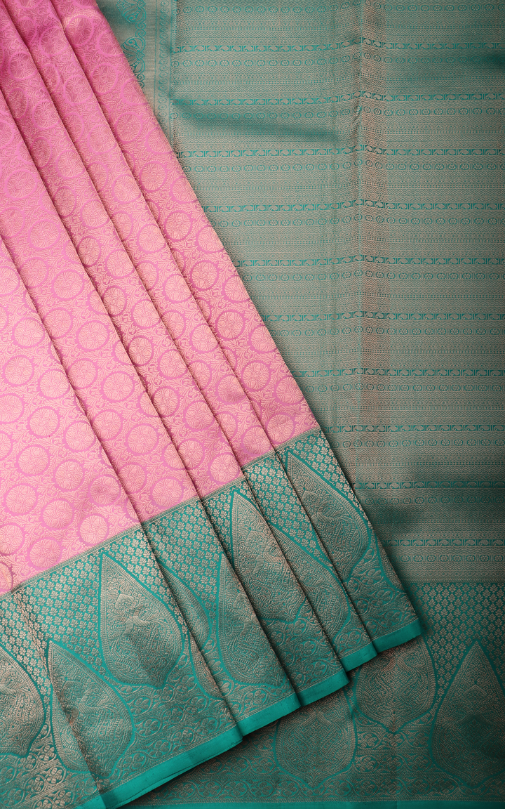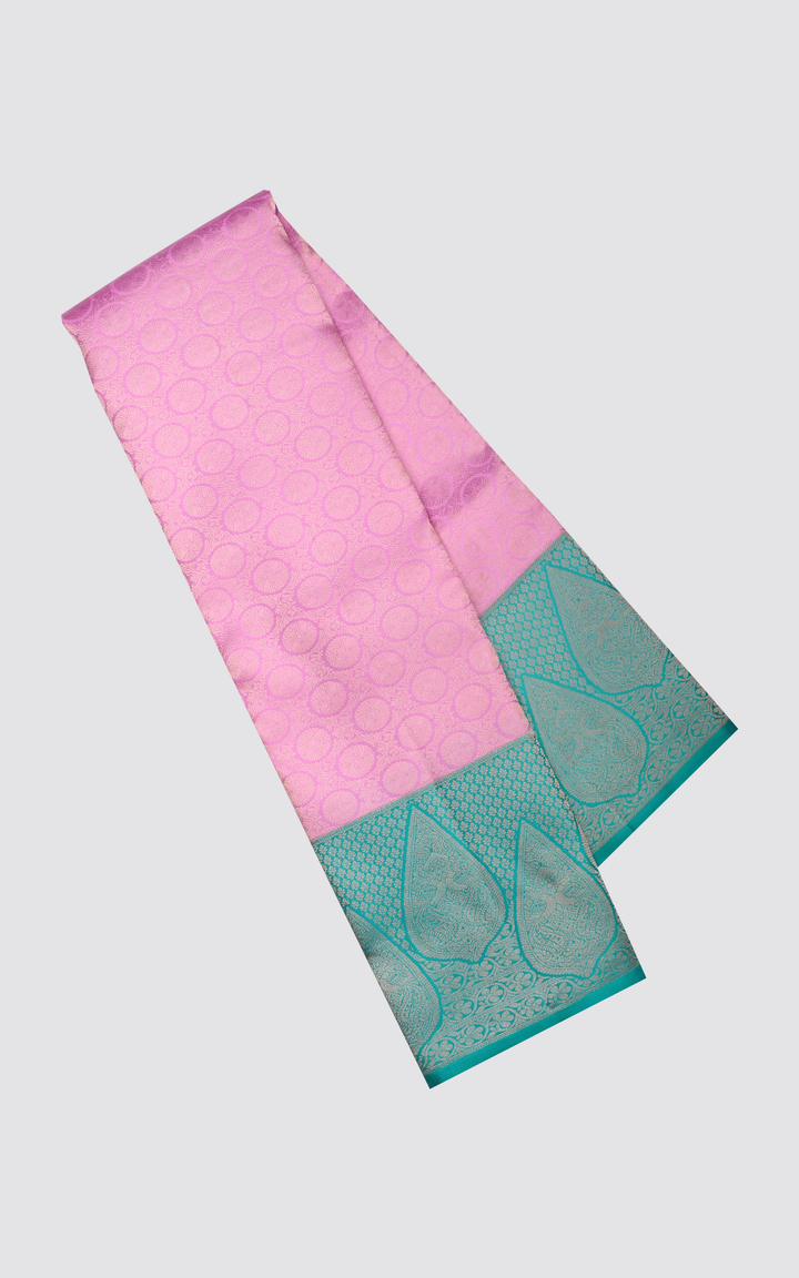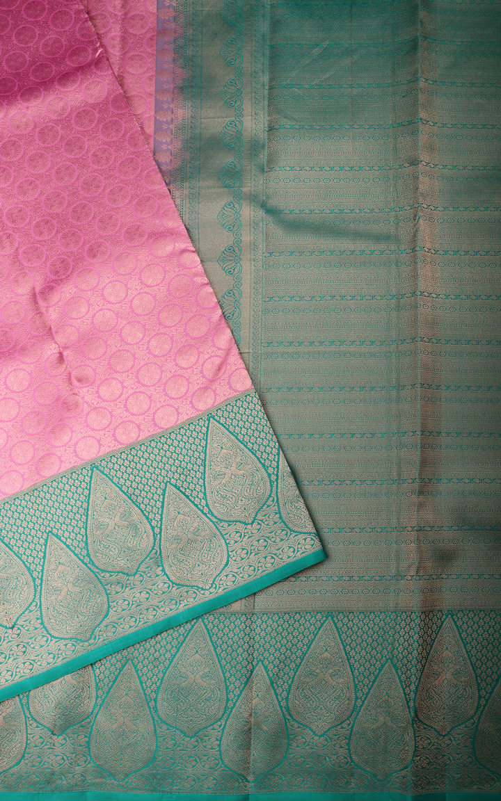 Pure Kanjivaram Silk Saree Pink and Teal Green with Allover Zari Brocade Weaves and Zari Woven Border