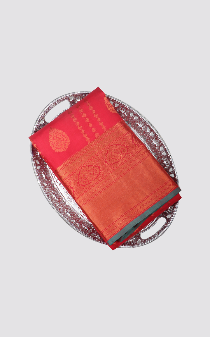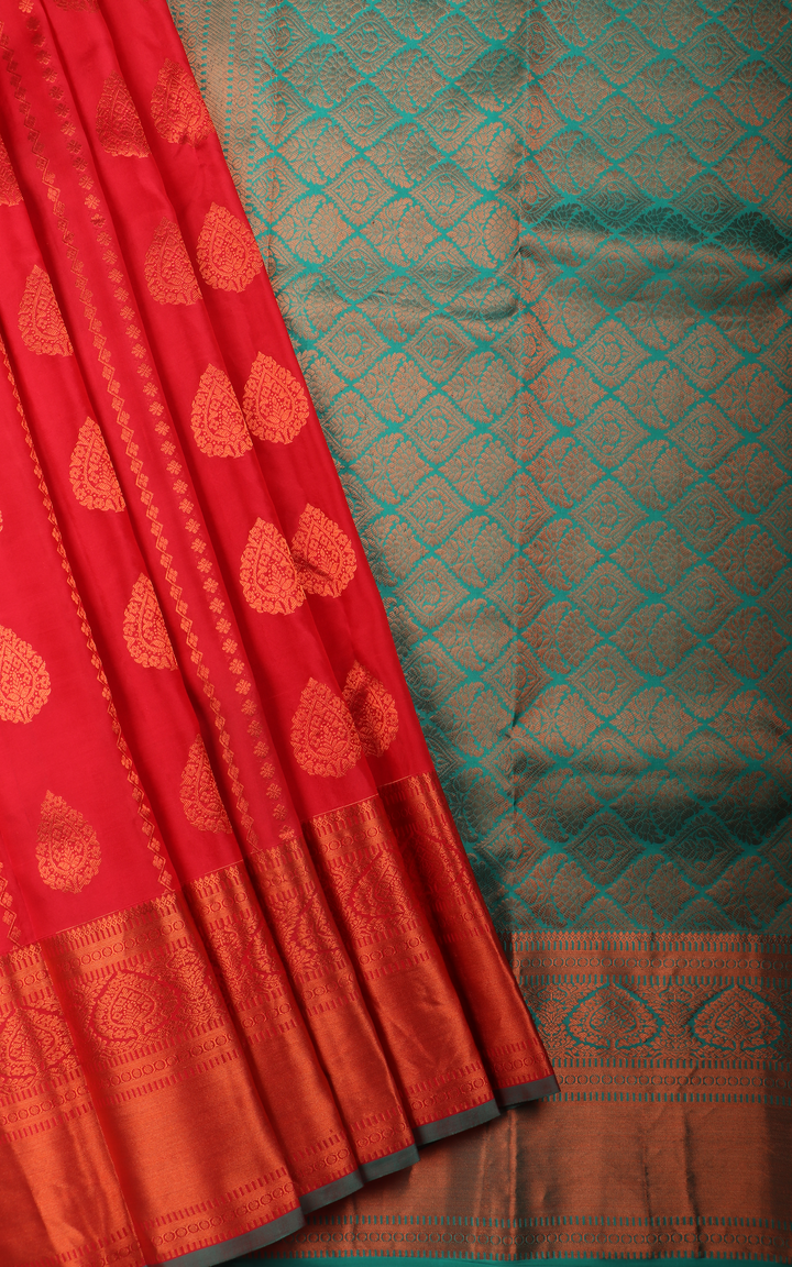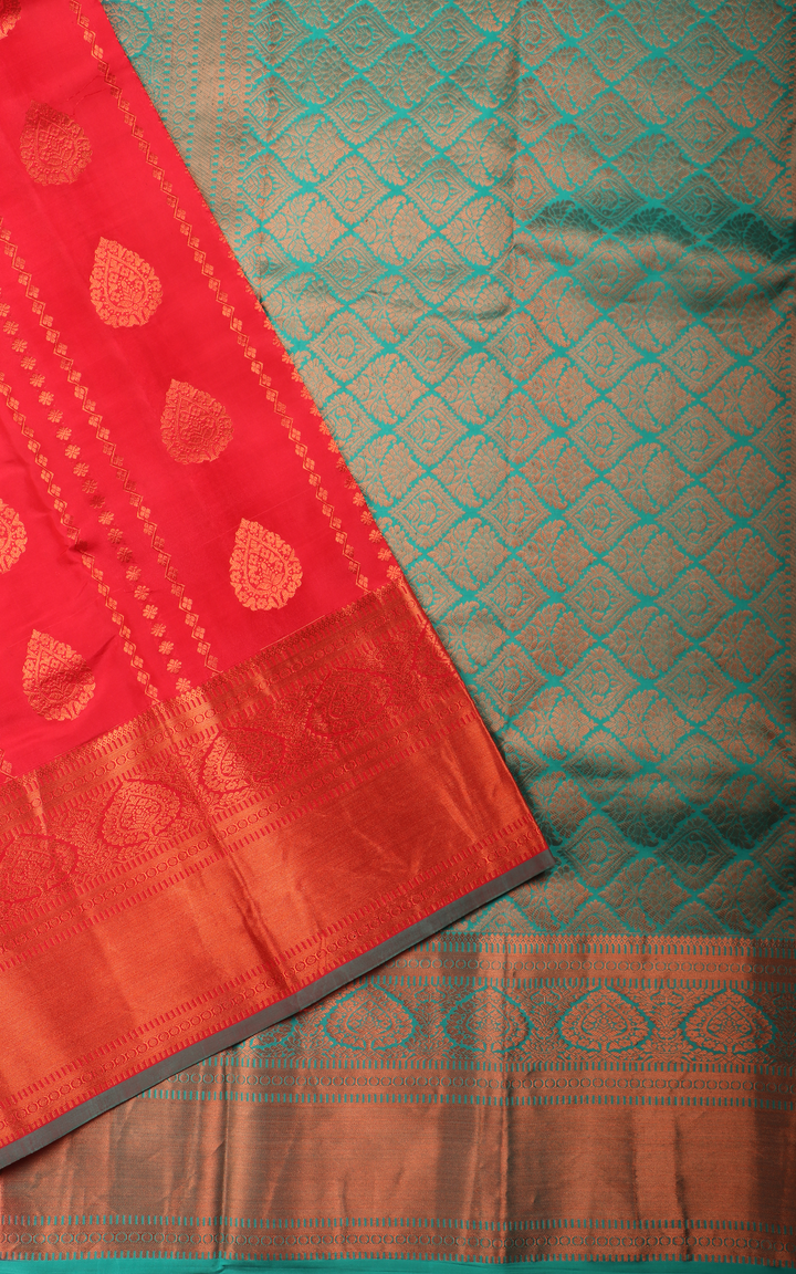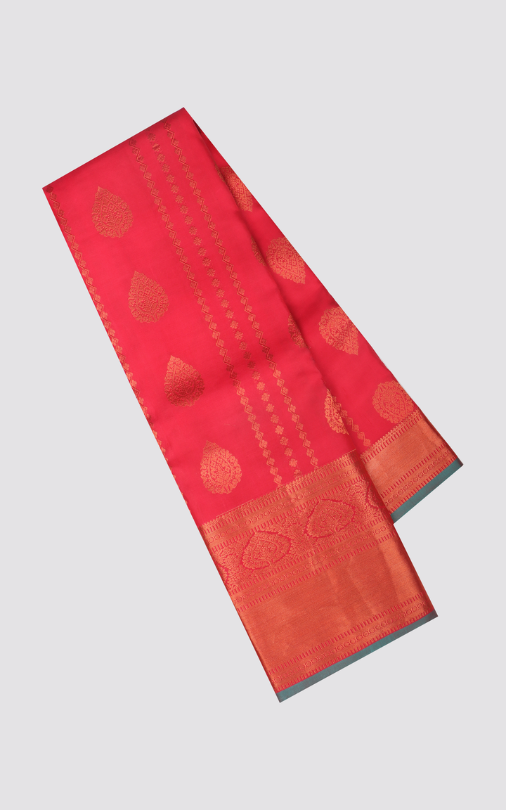 Pure Silk Saree Red and Green with zari woven stripes and zari woven buttas