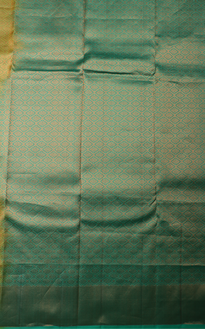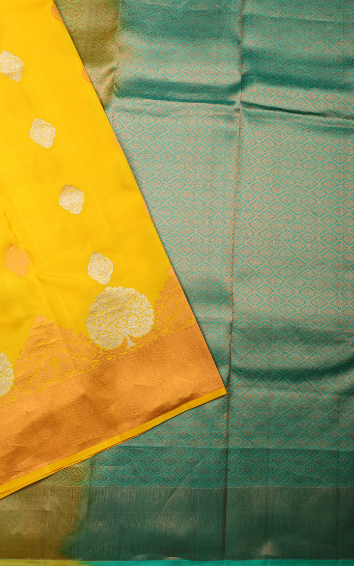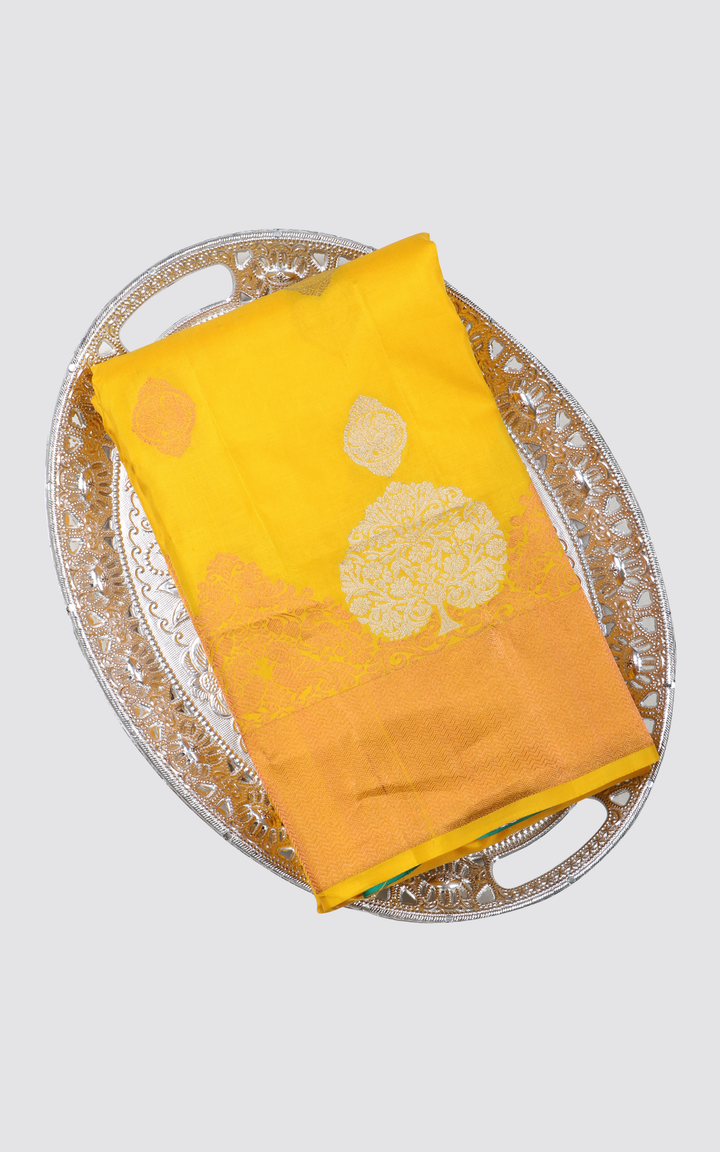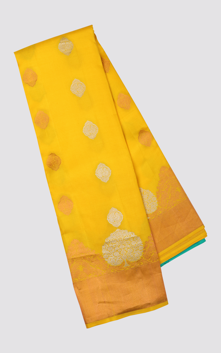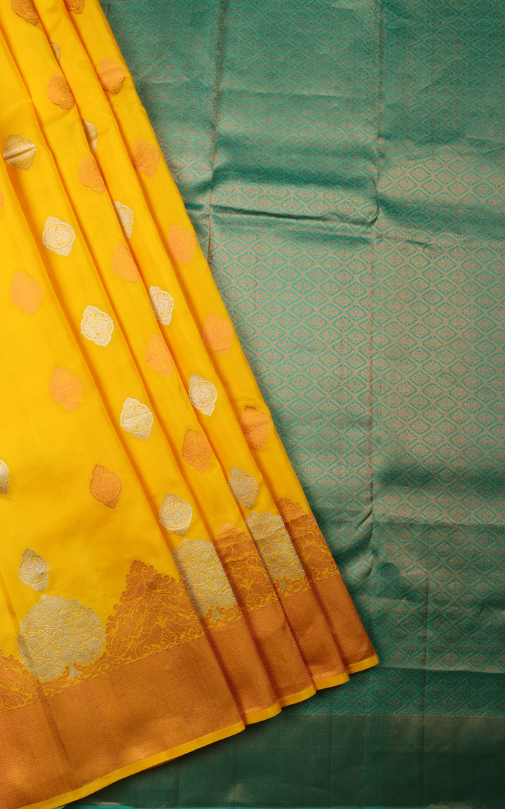 Pure Silk Saree Yellow and Green with Gold & Silver Zari Woven Buttas