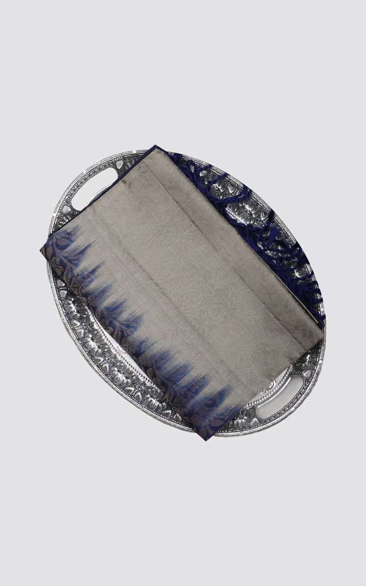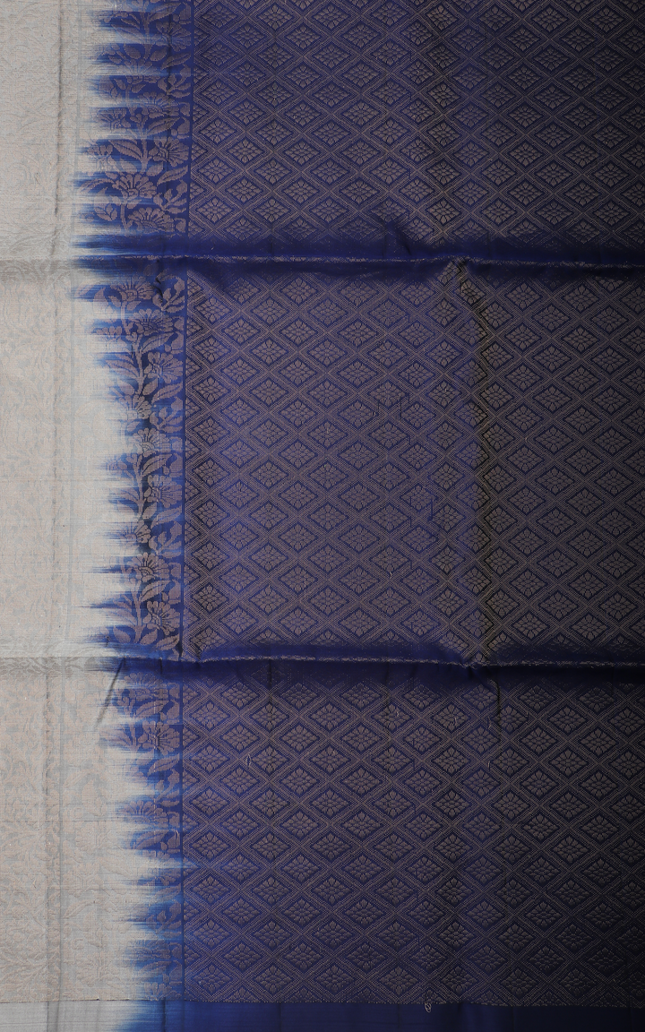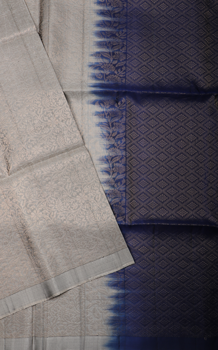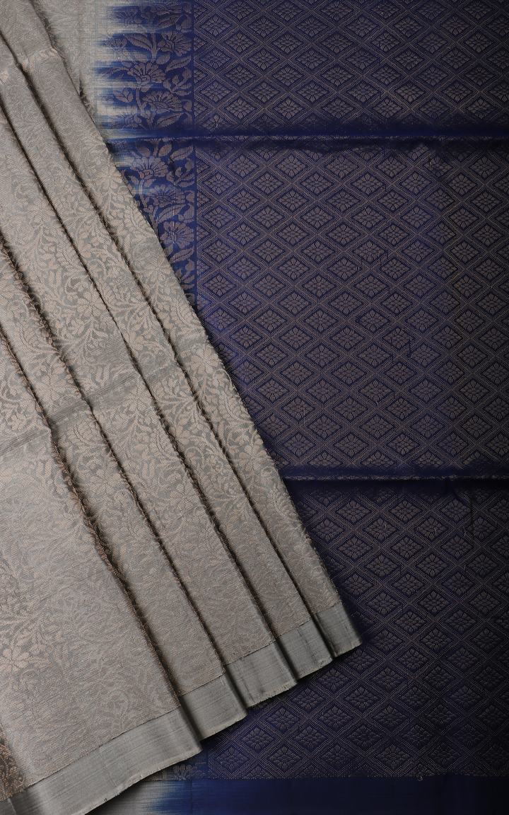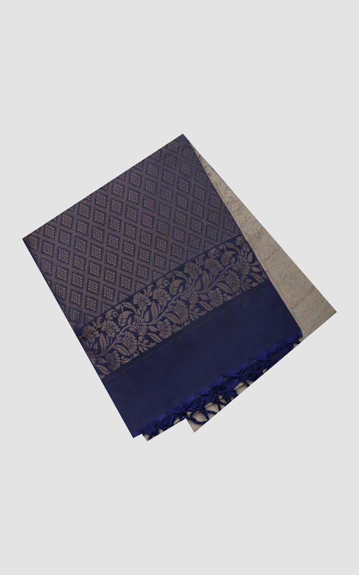 Pure Soft Silk Saree Gray and Navy Blue with Zari Brocade weaves in Borderless style