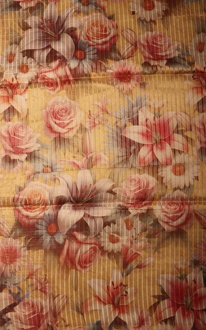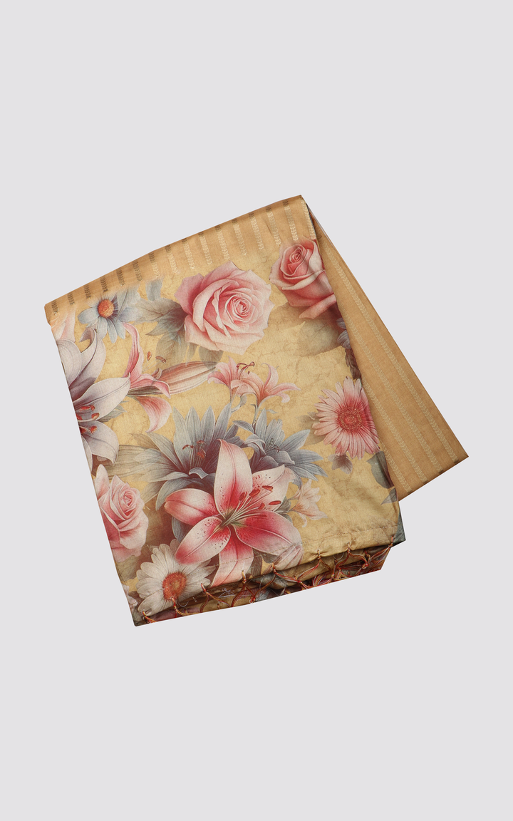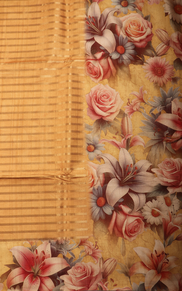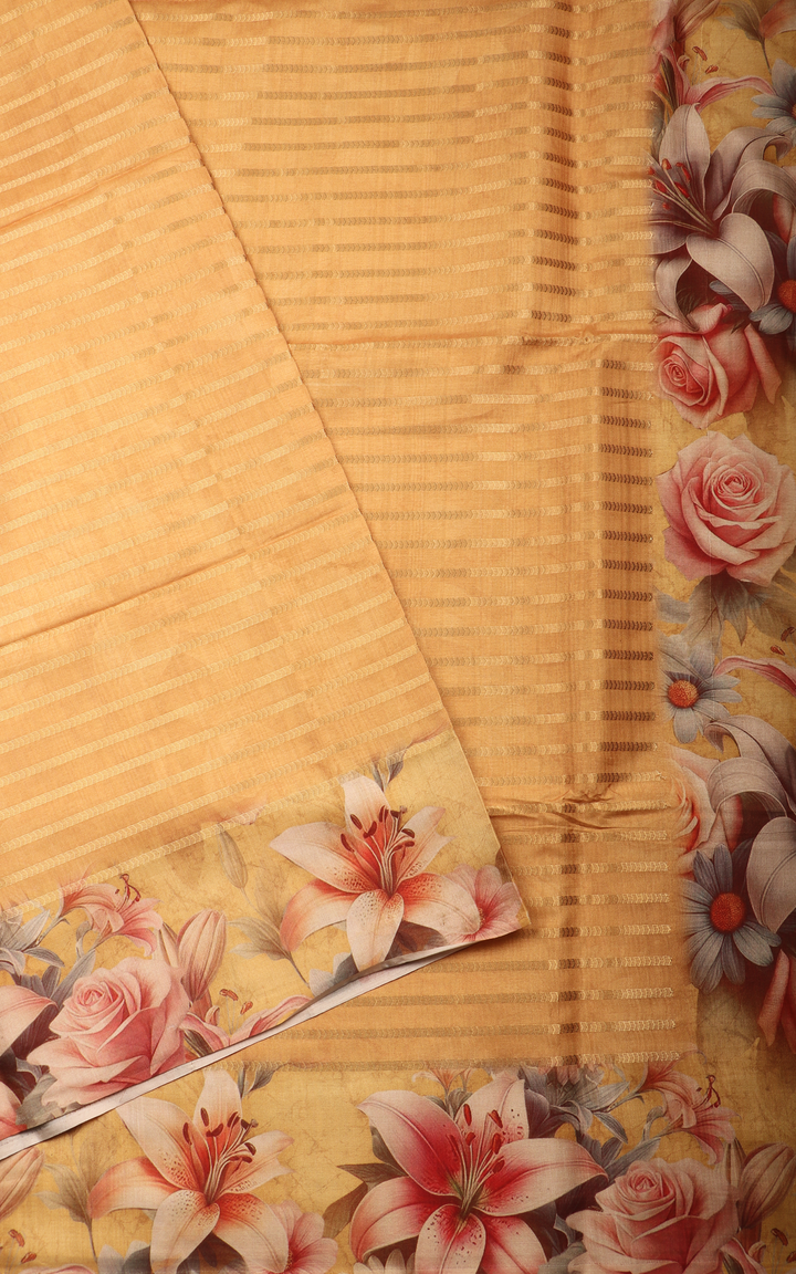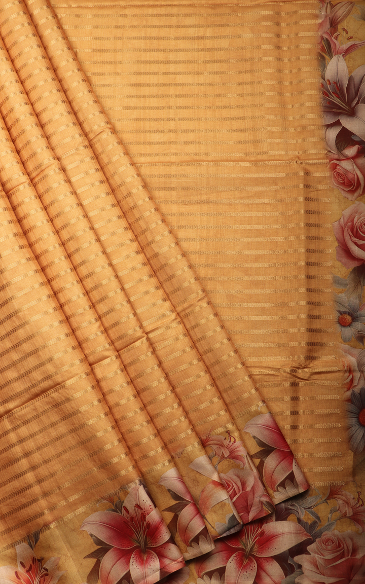 Semi Tussar Saree Mango Yellow with Allover Horizontal Zari Lines with Floral Digital Prints