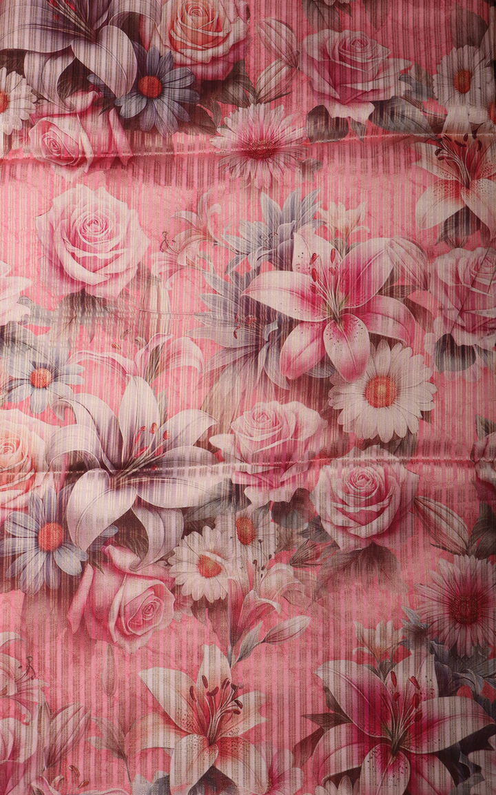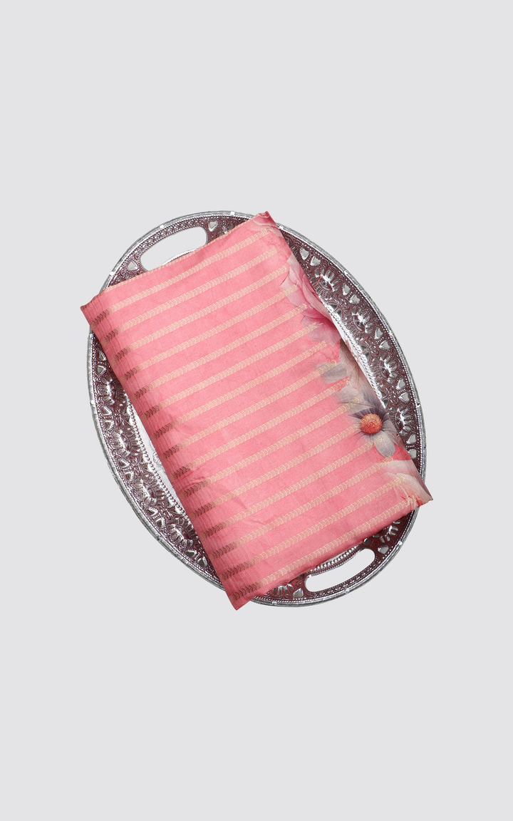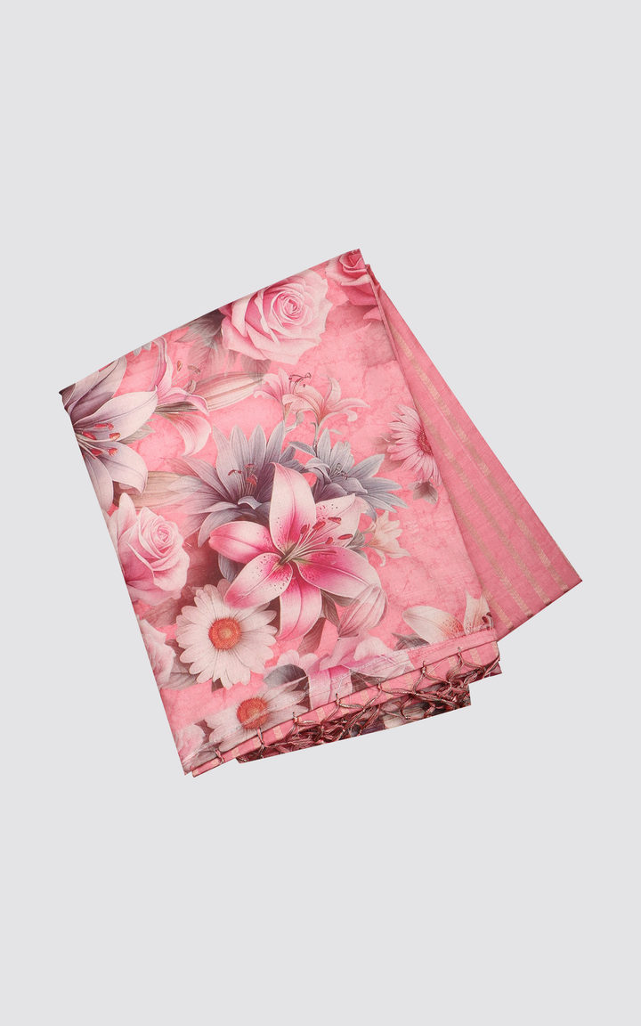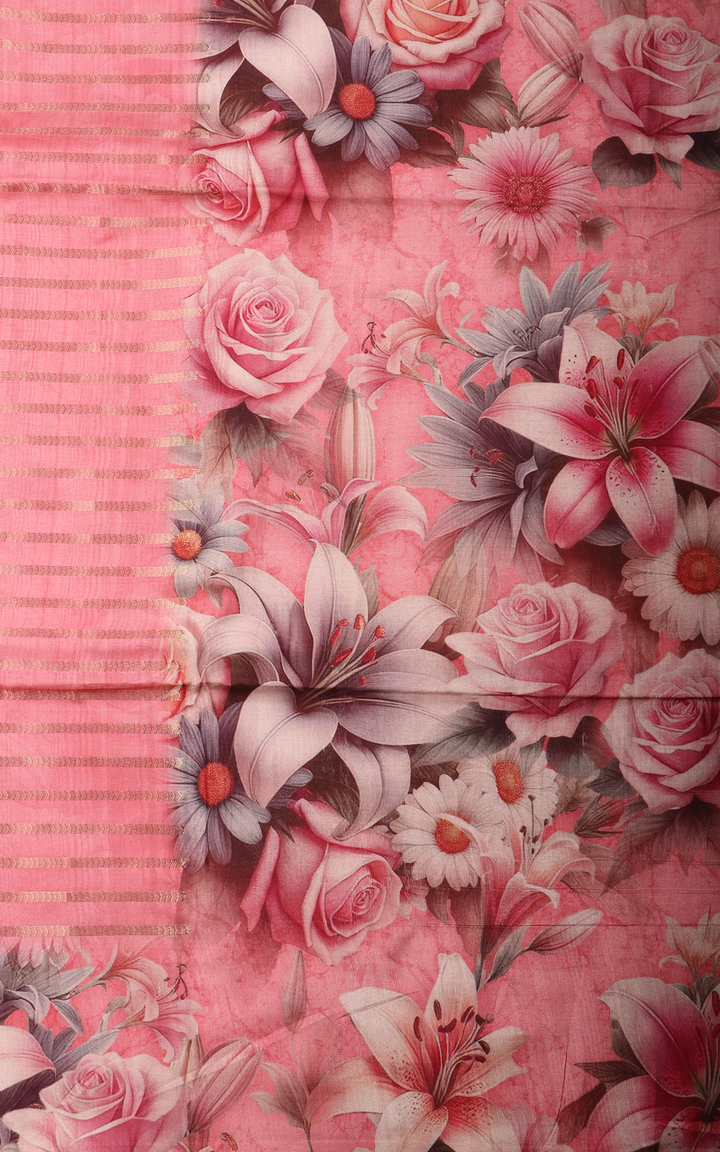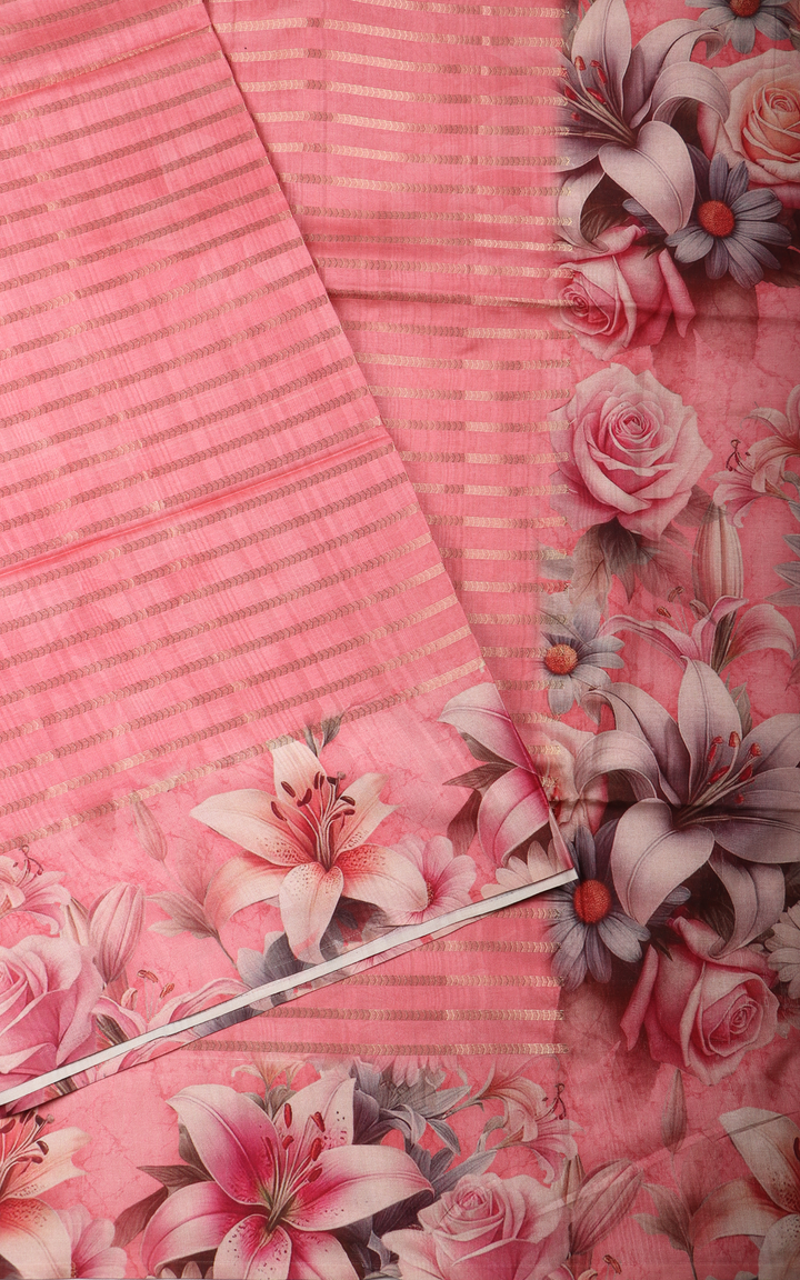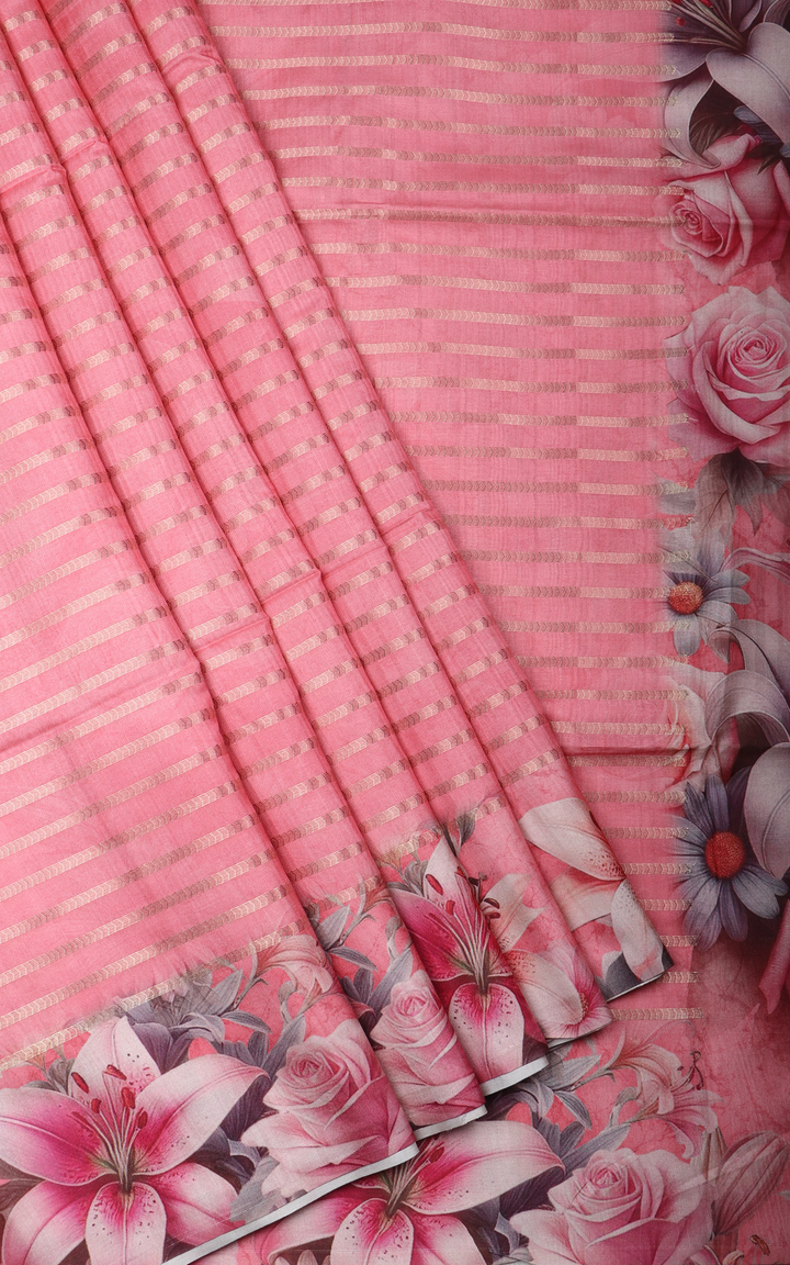 Semi Tussar Saree Peach with Allover Horizontal Zari Lines with Floral Digital Prints