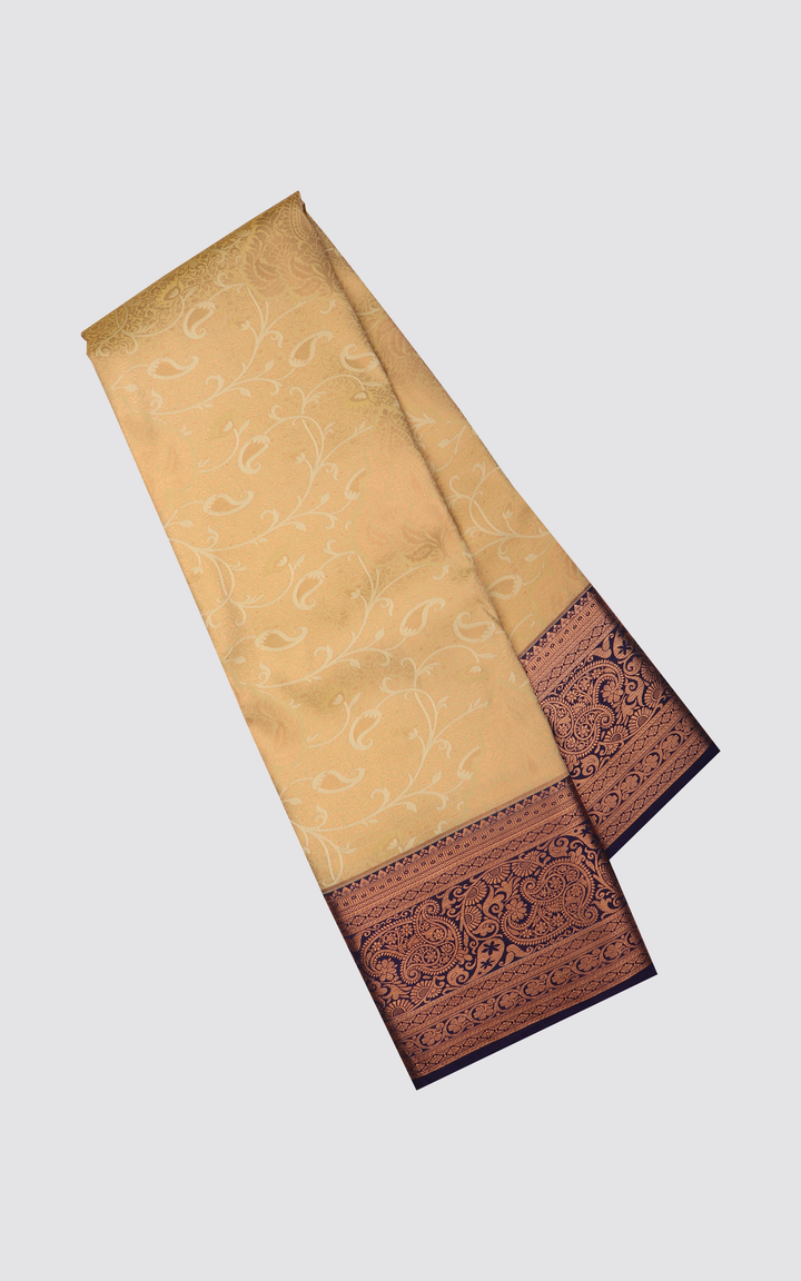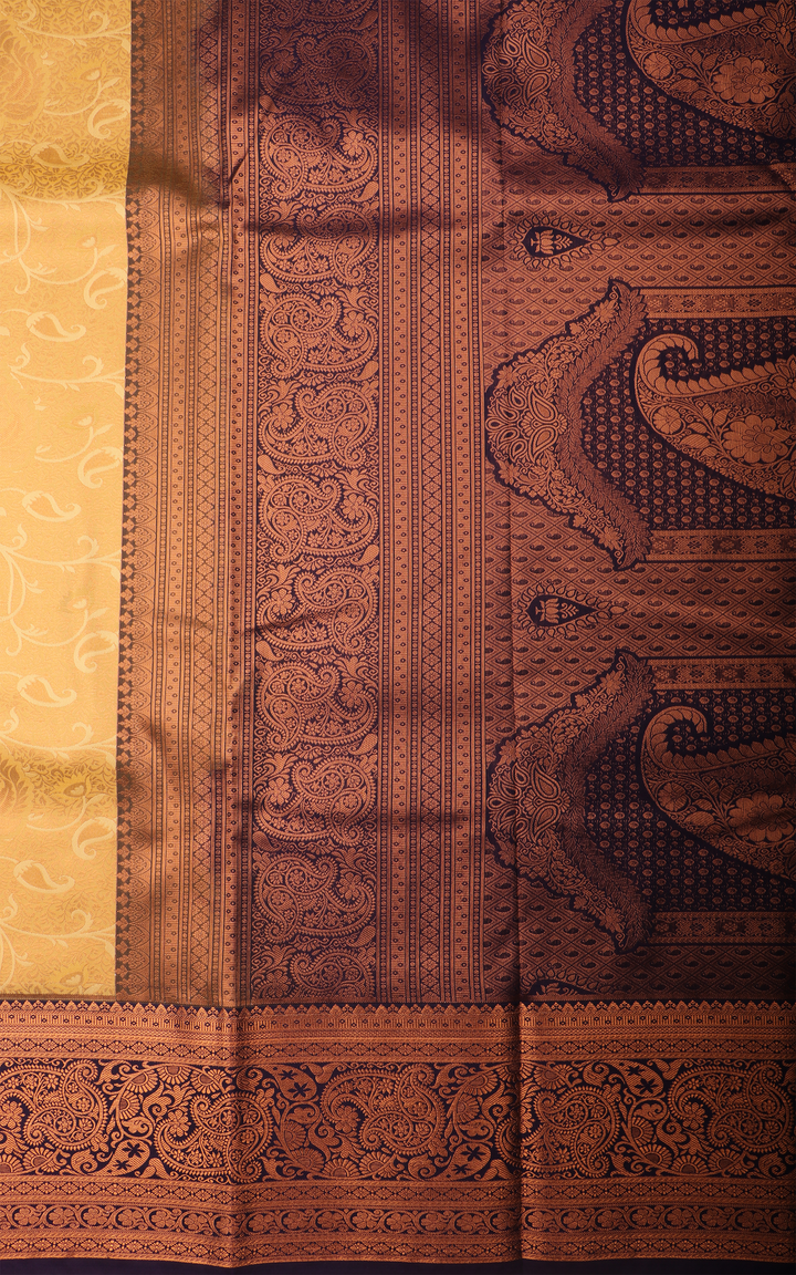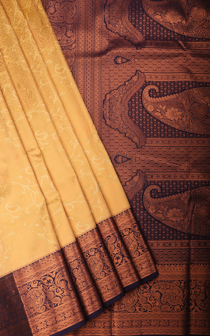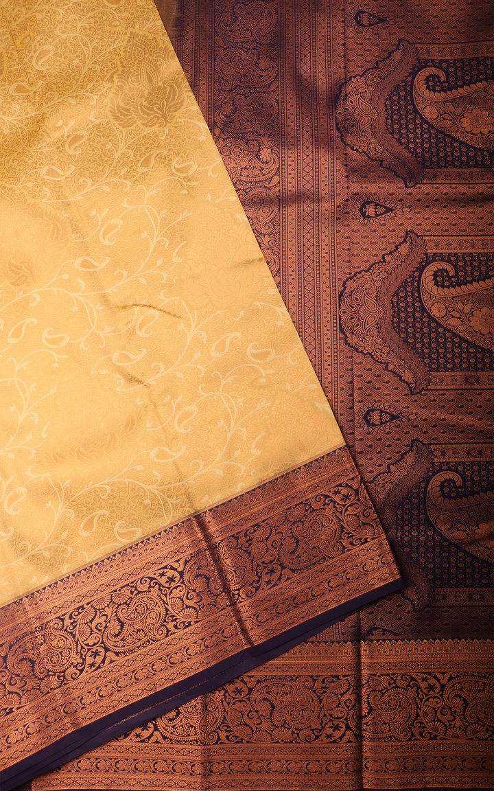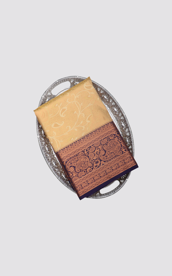 Yellow and Navy Blue Tissue Silk Saree with Allover Floral Zari Brocade Weaves and Zari Woven Contrast Border